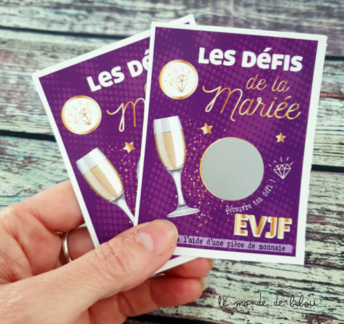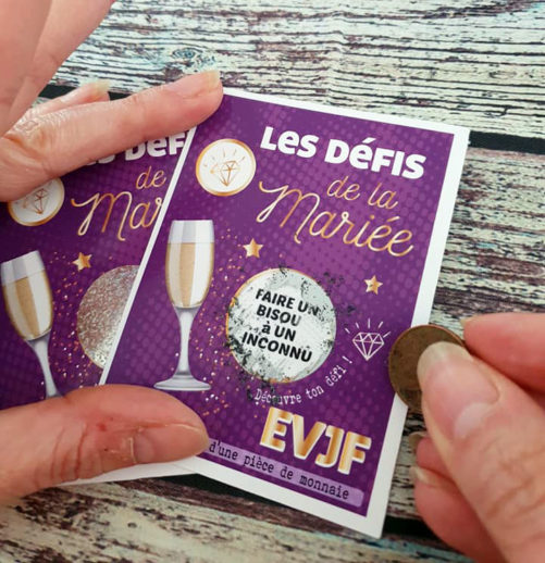 Un enterrement de vie de jeune fille sans les défis et gages de la future mariée n’est pas un EVJF digne de ce nom ! On vous propose un petit jeu amusement pour toute la team et pour la mariée. 6 Tickets à gratter défi de la mariée personnalisable. C’est votre défi sous la pastille à gratter !