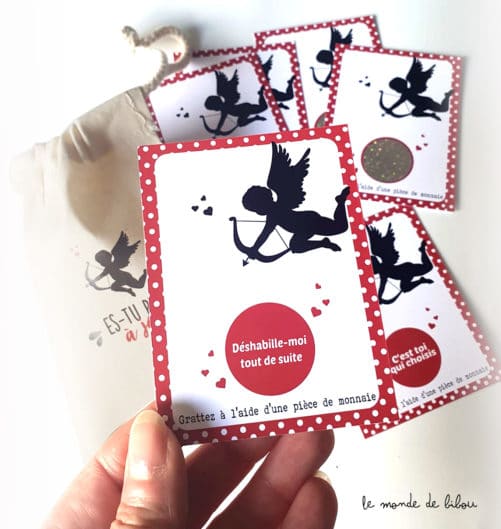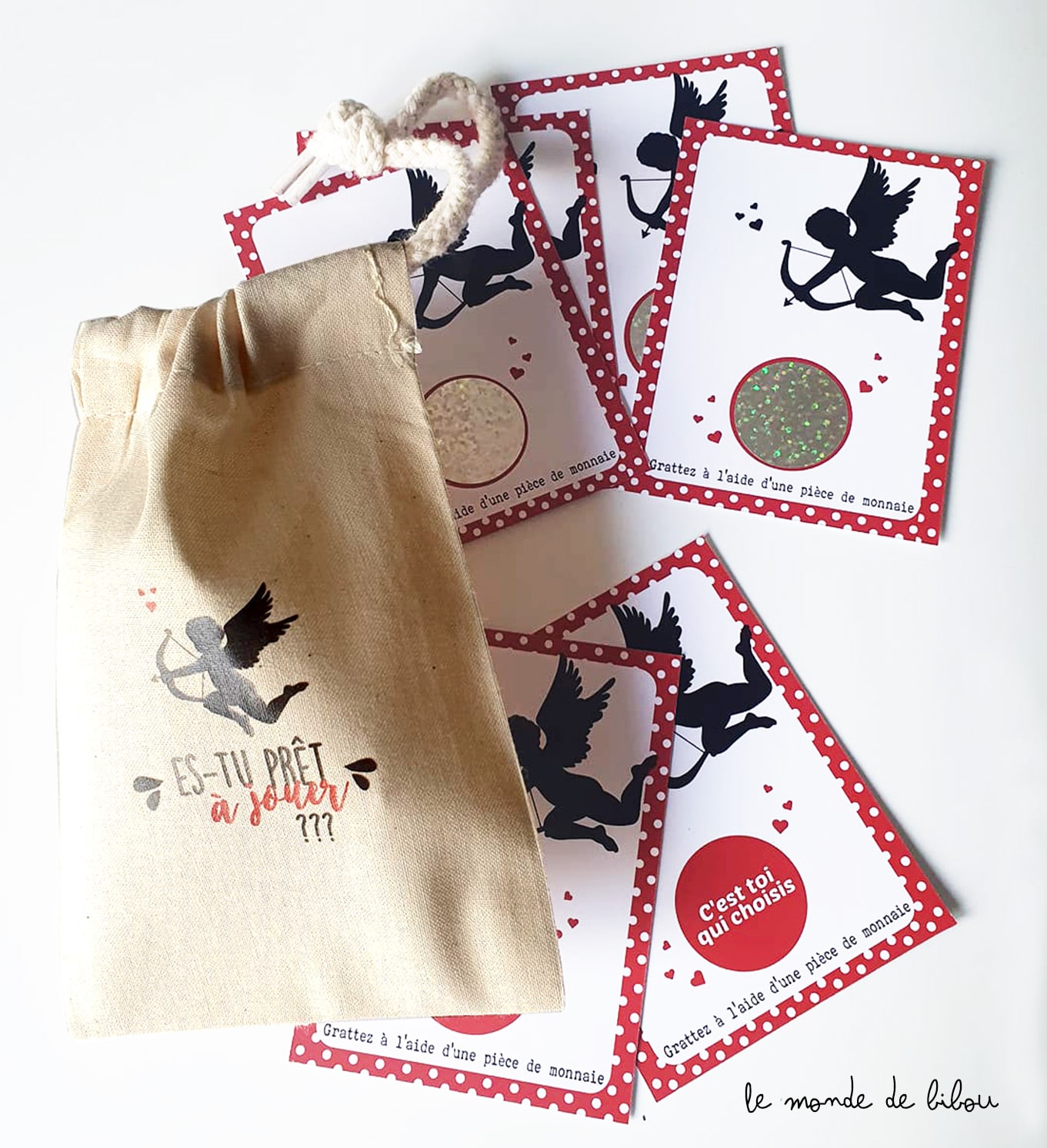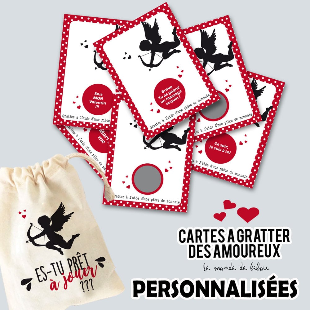 Nous avons créé ce lot de 6 Cartes à gratter et leur sac cadeau pour jouer avec votre chéri(e). Ces cartes à gratter sont personnalisables pour justement s’adapter à tous les amoureux. Elles seront glissées dans un petit sac pochon qui servira de sac cadeau pour encore plus de surprise et d’effet. A vous de nous fournir les 6 messages, annonces ou demandes. Laissez parler votre imagination, vos envies et vos sentiments… (pour vous aider nous vous proposons quelques exemples de messages que vous pouvez utiliser). A noter que les cartes sont numérotées et nous indiquons les messages dans l’ordre où ils sont écrits.