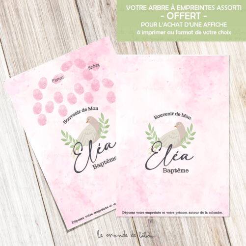Avec votre affiche numérique Bienvenue nous vous offrons un arbre à empreintes assorti, n’hésitez pas, c’est cadeau ! Il s’agit d’une jolie animation au cours de laquelle chaque invité dépose son empreinte (grâce à des tampons d’encre) et/ou son prénom. Vos convives laissent ainsi une trace de leur passage. L’arbre à empreintes change du traditionnel livre d’or, c’est parfait pour un Baptême !