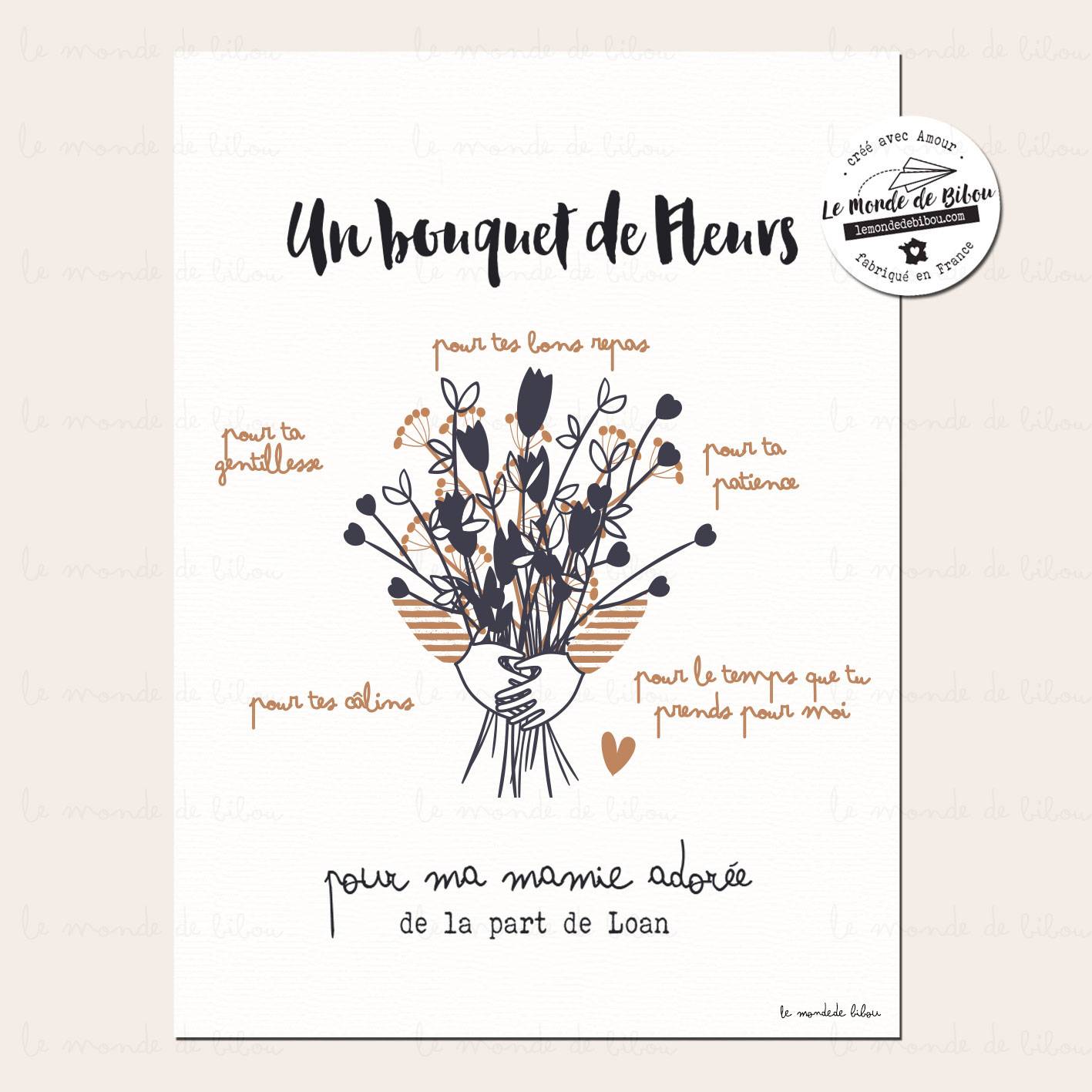 - Texte : Un bouquet de fleurs pour ma mamie adorée – de la part de Prénom(s) de votre choix + jusqu’à 5 petites phrases (ex : pour ta gentillesse, pour tes repas, pour les vacances en Espagne, etc…)