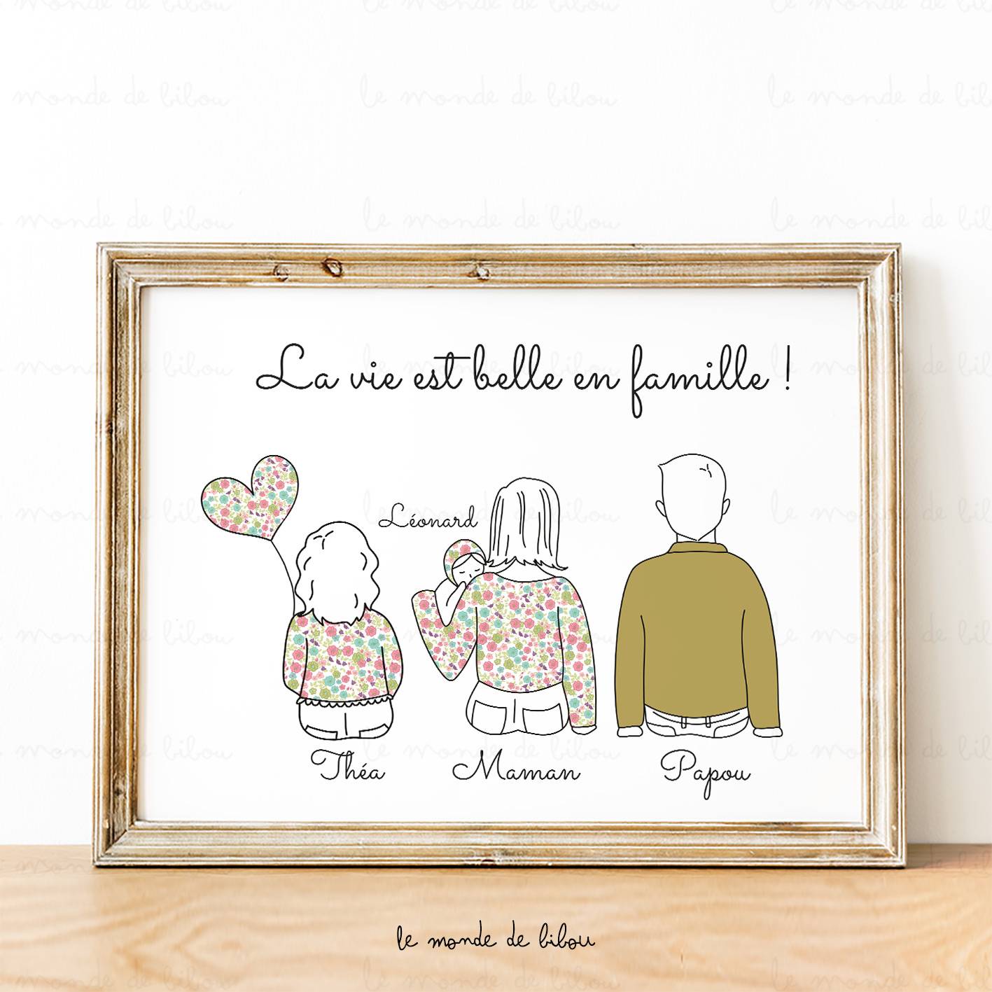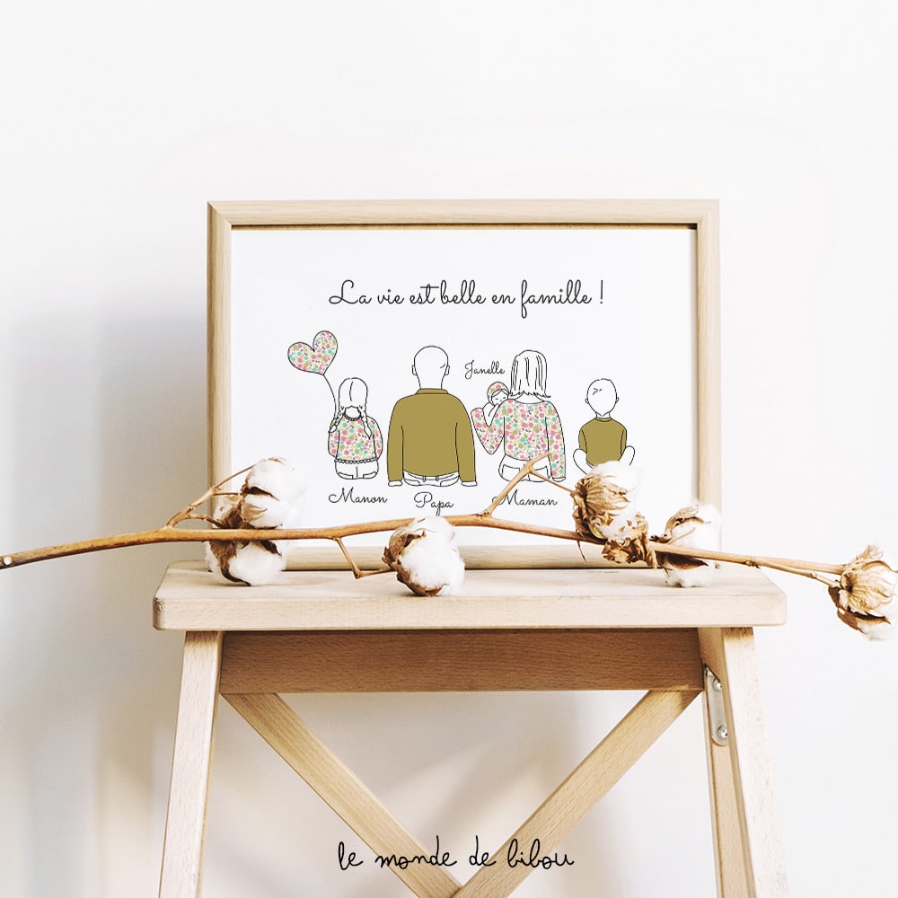 Voici une adorable collection « La vie est belle en famille ». Cette collection est une exclusivité le Monde de Bibou. Nos illustrations sont des créations uniques. Personnalisez l’Affiche La vie est belle en Famille avec les membres de la vôtre : ajoutez vos enfants, votre chien et indiquez leur prénom.
