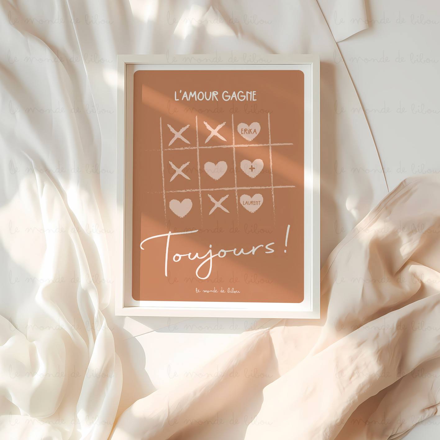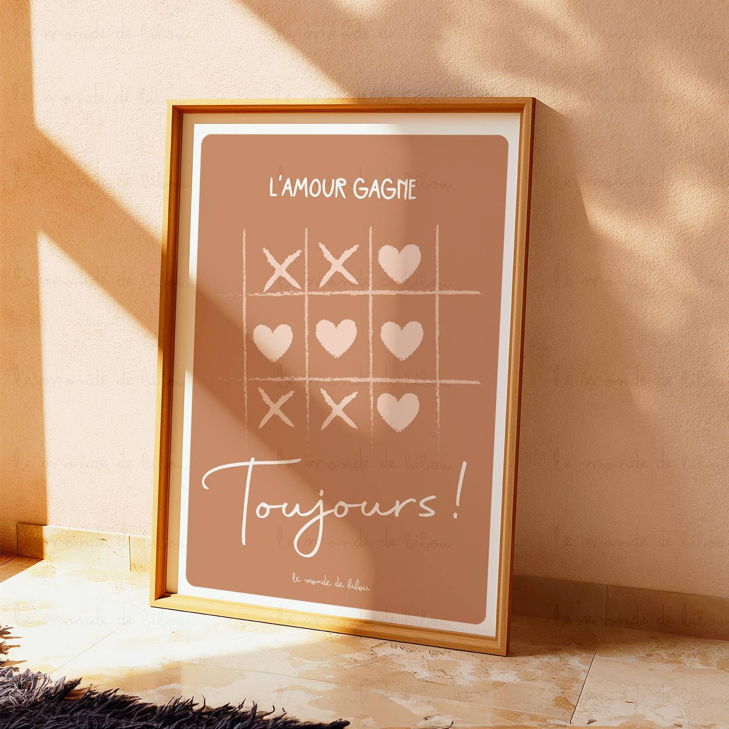 Exprimez l’amour avec élégance grâce à notre affiche design « L’Amour Gagne Toujours ». Inspirée d’un jeu de morpion revisité, cette création symbolise que l’amour est toujours gagnant. Ainsi, elle constitue une décoration parfaite pour les amoureux et est idéale à offrir pour la Saint-Valentin ou tout au long de l’année.