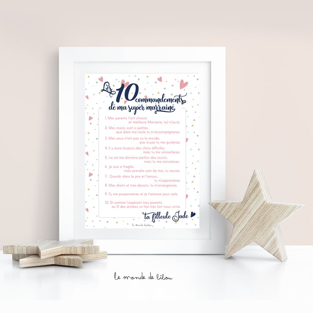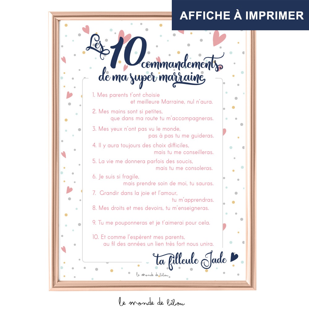 - Texte : « Les 10 commandements de ma super marraine – ton/ta filleul(e) PRÉNOM«