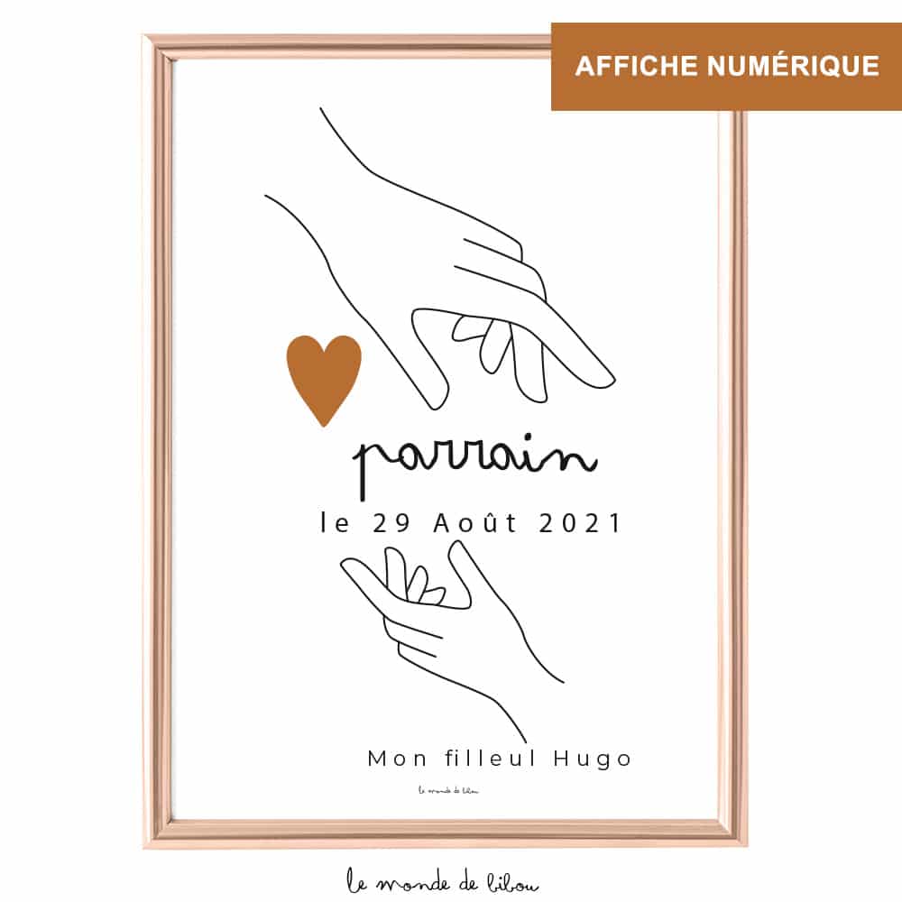 Notre Affiche numérique Parrain Mains sur le cœur à télécharger est une petite attention qui plaira forcement au parrain de votre enfant ! Une jolie affiche à imprimer par vous même à offrir lors d’un Baptême, d’un anniversaire ou même pour les fêtes de fin d’année. Notre affiche peut également servir de demande originale pour le futur parrain de votre enfant !