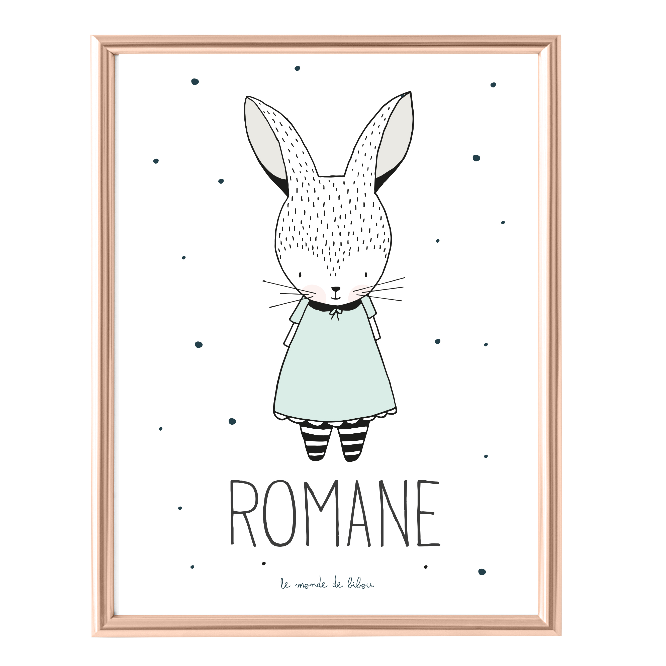 On l’adore cette jolie Affiche Prénom Petit Lapin personnalisée qui se mariera à merveille dans une chambre d’enfant. L’illustration du petit lapin portant une robe est réalisée avec couleurs douces et discrètes (vert minth). Le fond de l’affiche est blanc avec de discrets petits pois gris foncé. Cette affiche décorative plaira à coup sûr à l’enfant qui la recevra.