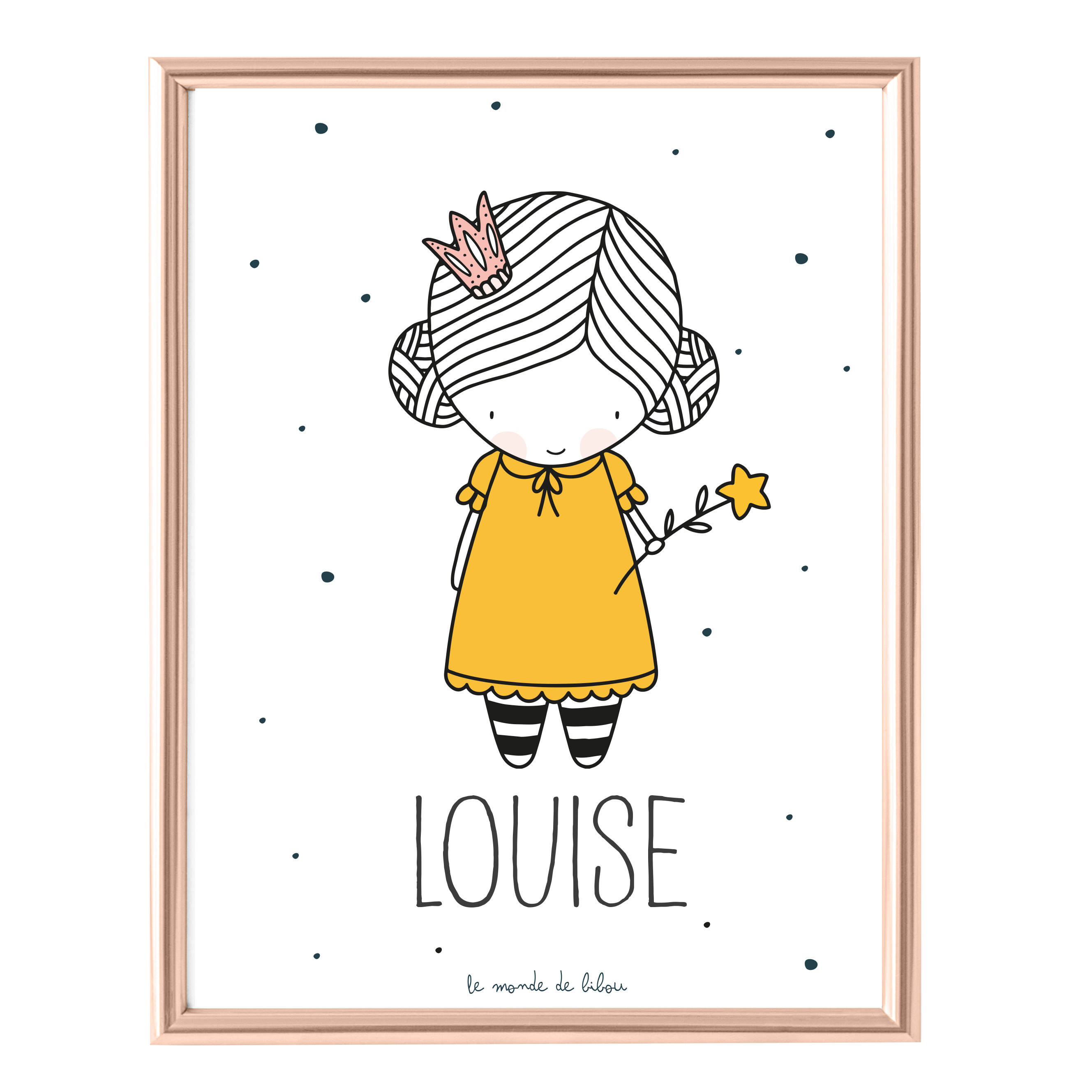 On l’adore cette jolie Affiche Prénom Petite Princesse personnalisée qui se mariera à merveille dans une chambre d’enfant. L’illustration de la petite fille avec sa couronne est réalisée avec couleurs douces et discrètes (jaune or et rose). Le fond de l’affiche est blanc avec de discrets petits pois gris foncé. Cette affiche décorative plaira à coup sûr à l’enfant qui la recevra.