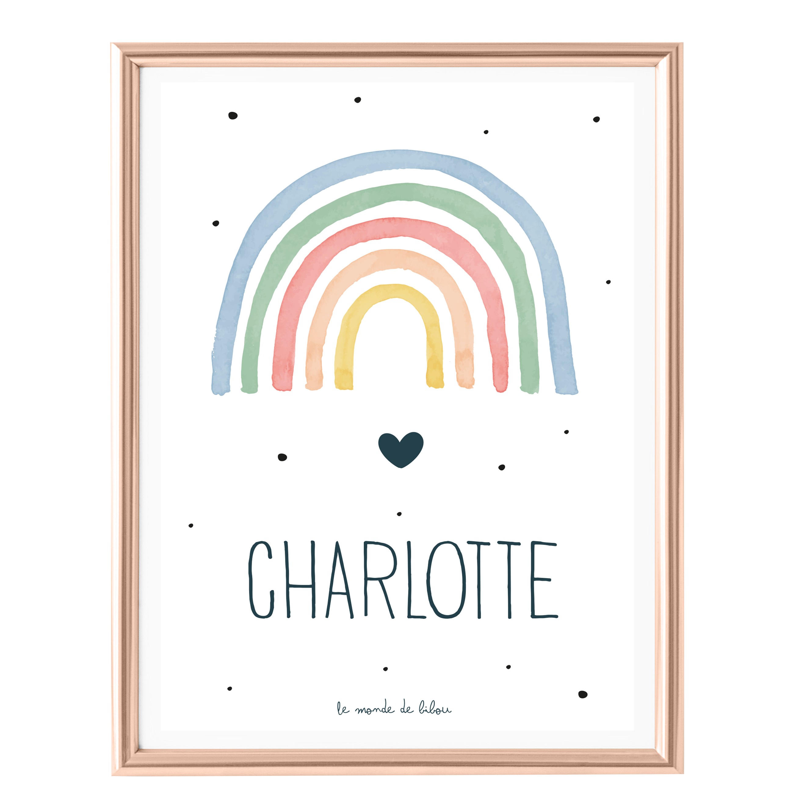 On l’adore cette jolie Affiche Prénom Rainbow couleurs qui se mariera à merveille dans une chambre d’enfant. L’illustration Rainbow, Arc-en-ciel, est réalisée avec un effet aquarelle. Cette affiche décorative plaira à coup sûr aux petits comme aux grands. Une jolie idée à offrir à votre ou vos enfants, mais aussi une belle idée pour que les grands-parents puissent gâter leurs petits-enfants ou même que les parrains et les marraines chouchoutent leurs filleuls…