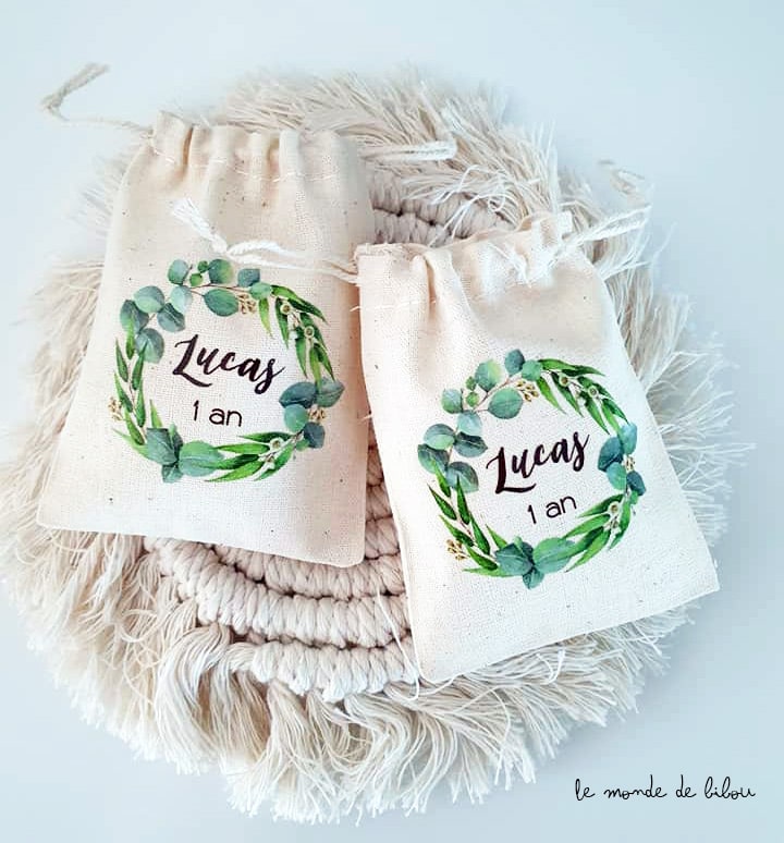 Vous recherchez un petit souvenir personnalisés de l’anniversaire de votre enfant, à offrir à vos convives ? Notre petit sac Ballotin anniversaire Couronne d’Eucalyptus est le présent idéal.