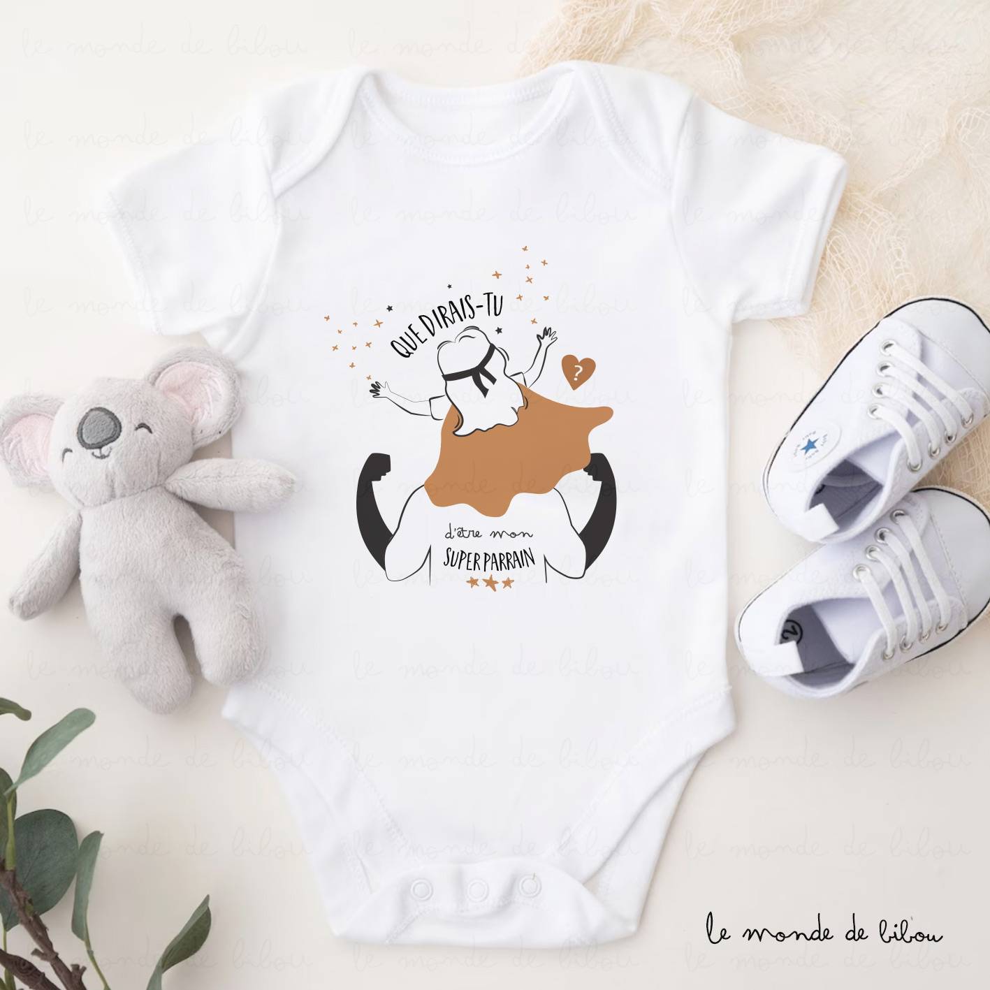 On adore ce petit Body Demande super Parrain. Ce body blanc à manches courtes ou longues pour enfants convient à tous les bébés, la fermeture à l’entrejambe se fait par pression pour faciliter le changement. C’est un chouette cadeau pour le futur parrain de votre petit bout. Une illustration unique, réalisée dans notre atelier.