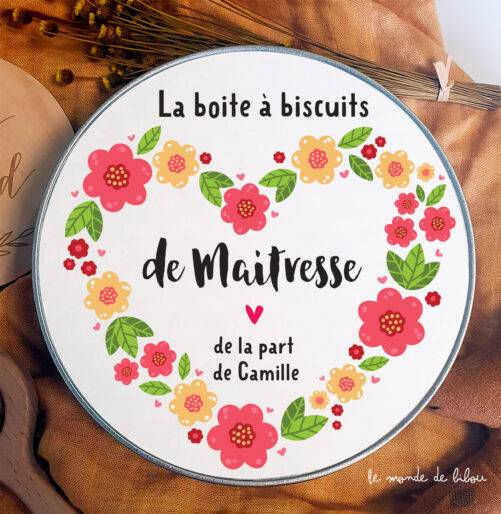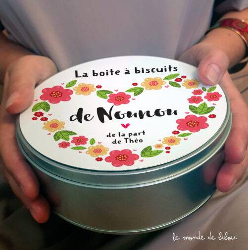 - Texte : « La boite à biscuits de Nounou/Maîtresse – De la part de Prénom de l’enfant »