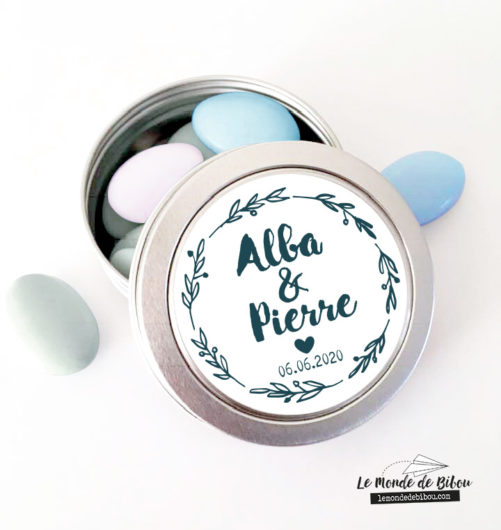 Cette ravissante petite boîte à dragées est personnalisable aux prénoms du couple et la date de l’événement.