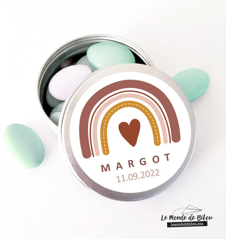 Cette ravissante petite Boîte à dragées personnalisée arc en ciel est personnalisable avec le prénom de l’enfant et la date de l’événement. C’est le cadeau idéal à offrir à vos invités lors de votre événement, que ce soit un Baptême, une Communion ou un anniversaire.