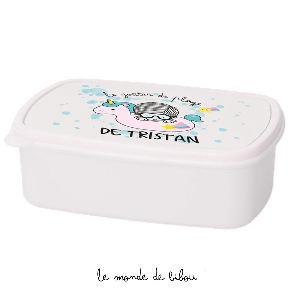 Notre boîte à repas personnalisée est idéale pour un petit garçon, on adore son illustration qui rappelle l’été et donne envie de partir en vacances ! La boîte est personnalisée au prénom de votre enfant mais vous pouvez également choisir le petit texte (par exemple : le goûter de plage, le pique-nique de plage, le goûter de vacances, etc…), attention 3 ou 4 mots maximum.