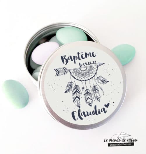 Cette ravissante petite Boîte dragées Attrape Rêves est personnalisable avec le prénom de l’enfant et la date de l’évènement. Le cadeau idéal à offrir à vos invités lors de votre évènement, que ce soit un Baptême, une Communion ou un anniversaire.