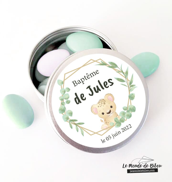 Cette ravissante petite Boîte dragées Bébé lion est personnalisable avec le prénom de l’enfant et la date de l’évènement. C’est le cadeau personnalisé idéal à offrir à vos invités lors de votre évènement, que ce soit un cadeau invités Baptême, Communion ou lors d’un anniversaire.