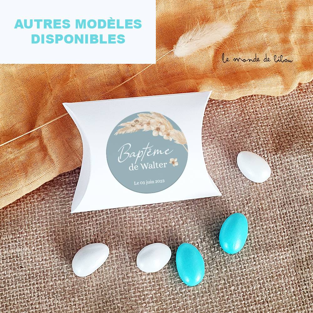 Notre Boîte dragées carton Bohème bleu personnalisée vous plaît ? Vous souhaitez peut-être encore plus de personnalisation avec votre propre thème ? N’hésitez pas à nous demander, nous vous proposons un service sur-mesure. Retrouvez tous nos modèles de contenants à dragées (Boîtes pillow en carton, Sacs Ballotin et Boîtes à dragées) sur la boutique Le Monde de Bibou.