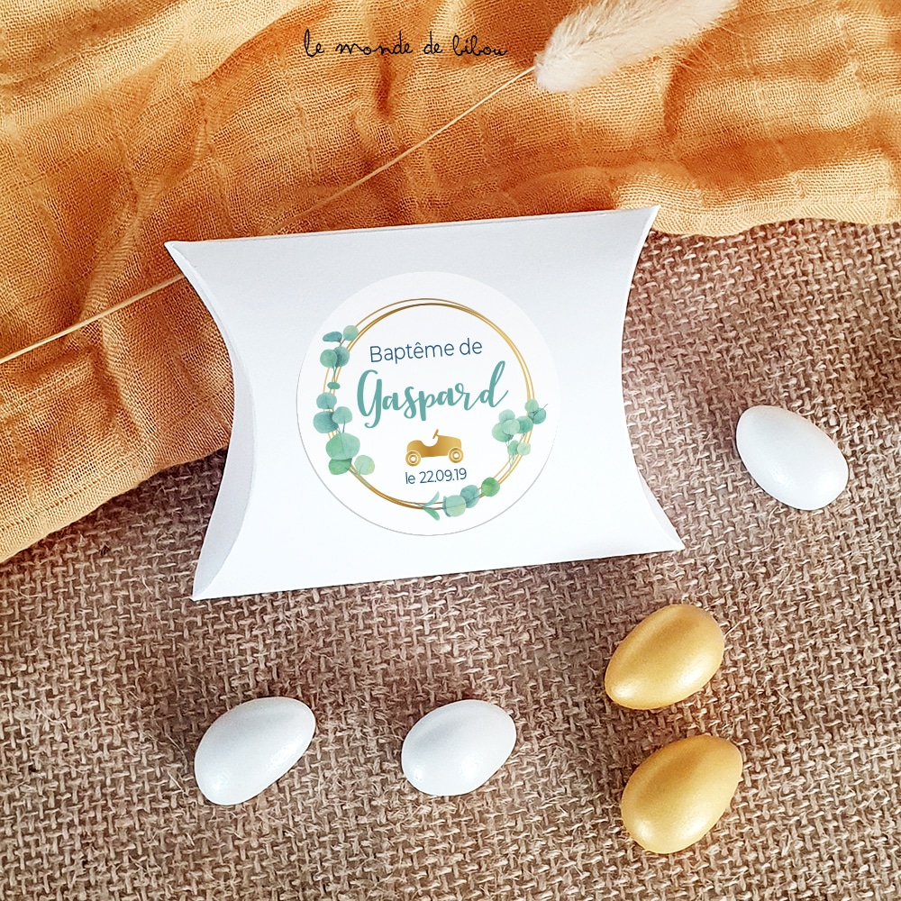 Les boîtes pillow en carton vous seront livrées non pliées, les stickers personnalisées seront déjà collés, il ne vous restera plus qu’à les assembler et les garnir de dragées.