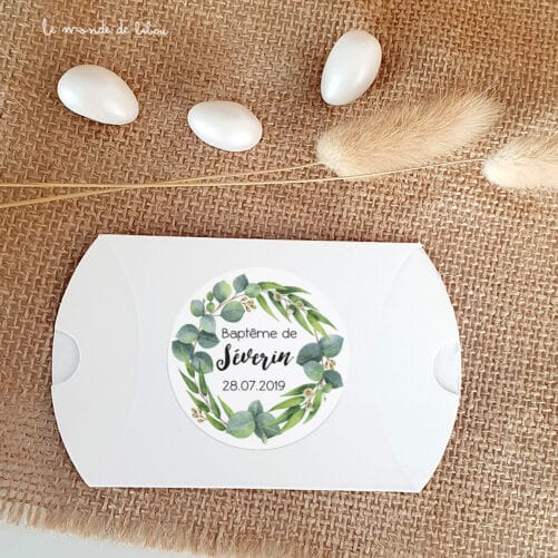 Cette petite Boîte dragées carton Eucalyptus est personnalisable avec le prénom de l’enfant, la date et la nature de l’évènement. C’est le cadeau personnalisé petit prix idéal à offrir à vos invités lors de votre évènement, que ce soit un cadeau invités Baptême, Communion ou lors d’un anniversaire.