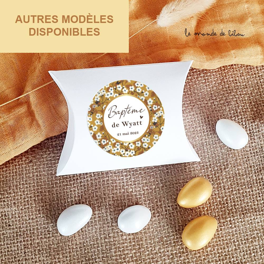 Notre Boîte dragées carton Liberty caramel personnalisée vous plaît ? Vous souhaitez peut-être encore plus de personnalisation avec votre propre thème ? N’hésitez pas à nous demander, nous vous proposons un service sur-mesure. Retrouvez tous nos modèles de contenants à dragées (Boîtes pillow en carton, Sacs Ballotin et Boîtes à dragées) sur la boutique Le Monde de Bibou.