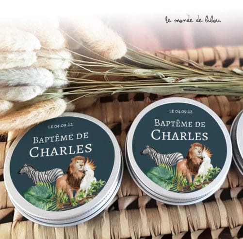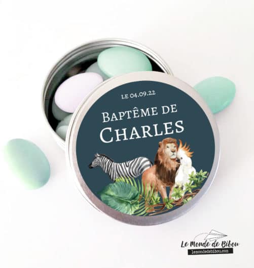 Cette ravissante petite Boîte dragées Jungle est personnalisable avec le prénom de l’enfant et la date de l’évènement. Le cadeau idéal à offrir à vos invités lors de votre évènement, que ce soit un Baptême, une Communion ou un anniversaire.