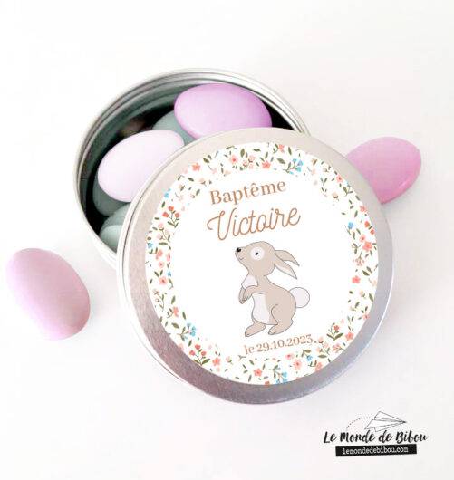 Cette ravissante petite Boîte dragées Lapin Liberty est personnalisable avec le prénom de l’enfant et la date de l’évènement. C’est le cadeau personnalisé idéal à offrir à vos invités lors de votre évènement, que ce soit un cadeau invités Baptême, Communion ou lors d’un anniversaire.