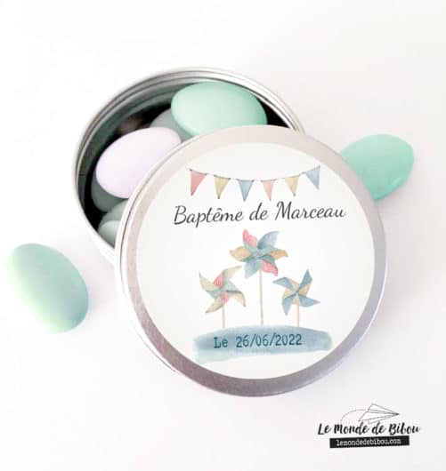 Cette ravissante petite Boîte dragées Moulin à vent est personnalisable avec le prénom de l’enfant et la date de l’événement. Le cadeau idéal à offrir à vos invités lors de votre événement, que ce soit un Baptême, une communion ou un anniversaire.