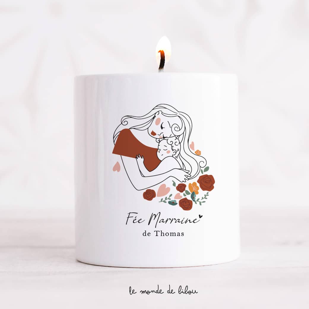 Voici un joli cadeau parfumé pour sa marraine. On adore cette grosse Bougie Fée marraine personnalisée. Elle offrira environ 50h de temps de combustion. C’est le cadeau idéal à offrir pour un anniversaire, comme cadeau de Noël, un Baptême ou juste pour faire plaisir… N’hésitez pas à associer notre Couvercle en liège pour bougie afin de sublimer votre bougie souvenir personnalisée et la rendre encore plus jolie et unique.