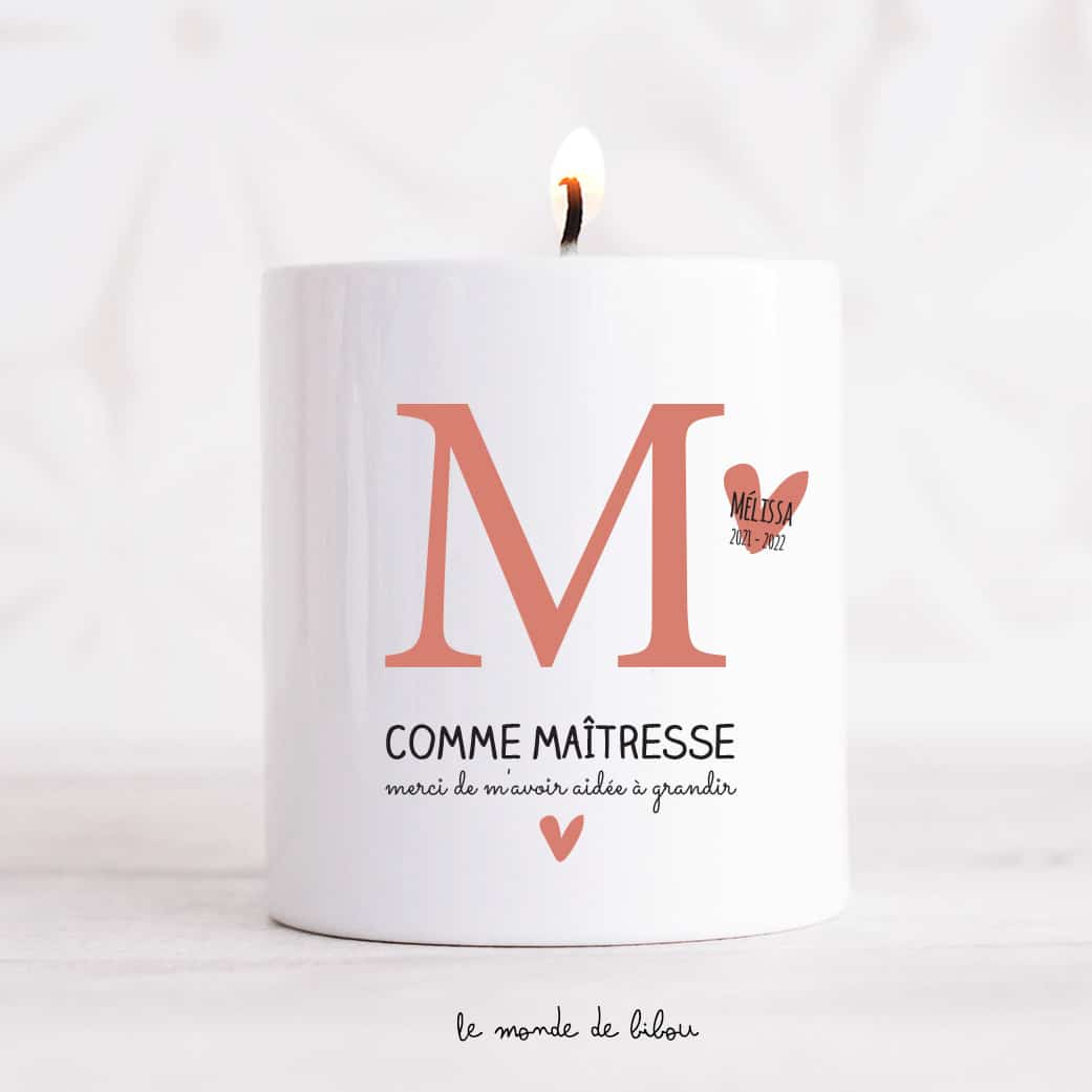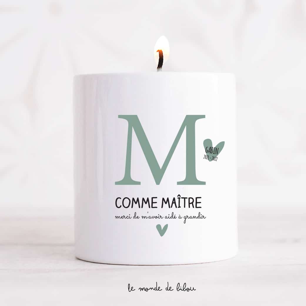 Voici un joli cadeau pour un maître ou une maîtresse, on adore cette grosse Bougie M comme maître maîtresse personnalisée et parfumée. Cette bougie personnalisée offrira environ 50h de temps de combustion. C’est le cadeau idéal à offrir pour la fin de d’année scolaire. La bougie est personnalisée au prénom de votre enfant, pour que l’enseignant puisse garder un joli souvenir de l’année scolaire écoulée avec son élève.