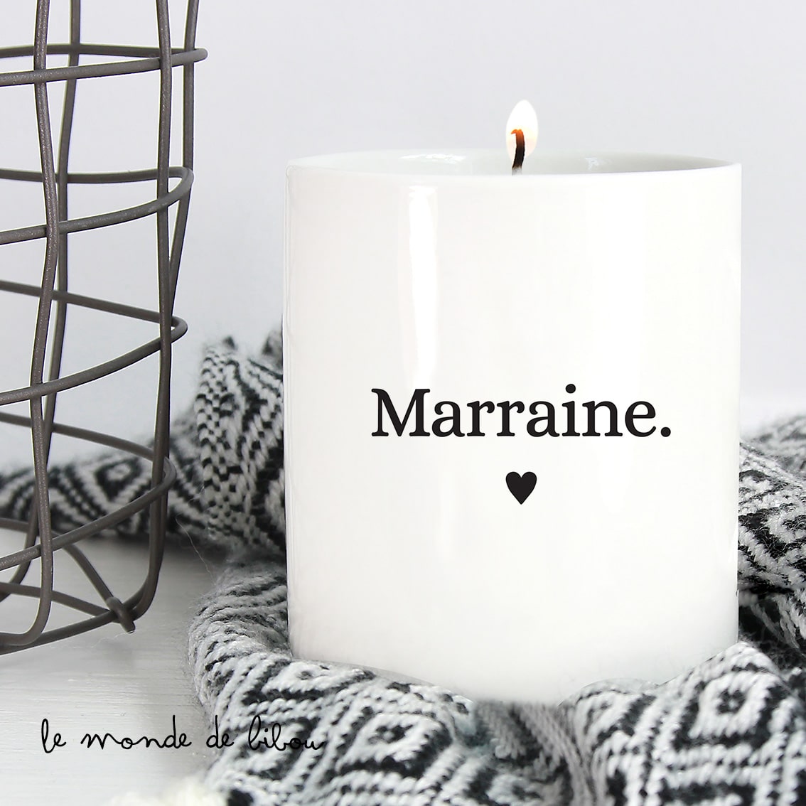 Voici un joli cadeau parfumé pour sa marraine. On adore cette grosse Bougie parfumée personnalisée Marraine. Elle offrira environ 50h de temps de combustion. C’est le cadeau idéal à offrir pour un anniversaire, comme cadeau de Noël, un Baptême ou juste pour faire plaisir… N’hésitez pas à associer notre Couvercle en liège pour bougie afin de sublimer votre bougie souvenir personnalisée et la rendre encore plus jolie et unique.