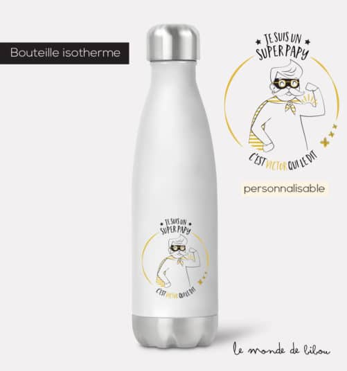 Fini les bouteilles en plastique jetables, vraiment pas écologique, on pense gourde et bouteille isotherme maintenant. Notre Bouteille isotherme Papy Super héros personnalisée est une chouette idée de cadeau pour son grand-père adoré !