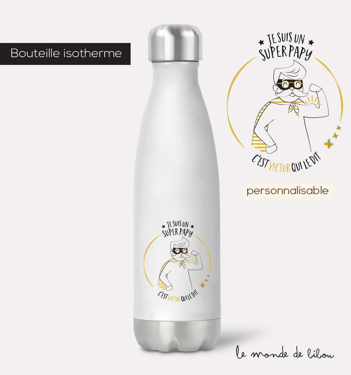 Notre Bouteille isotherme Papy Super héros personnalisée vous plaît ? Alors venez découvrir tous nos indispensables du quotidien spécialement crées pour vous faciliter la vie de tous les jours. Retrouvez également tous nos cadeaux pour les papys et les mamies dans la boutique.