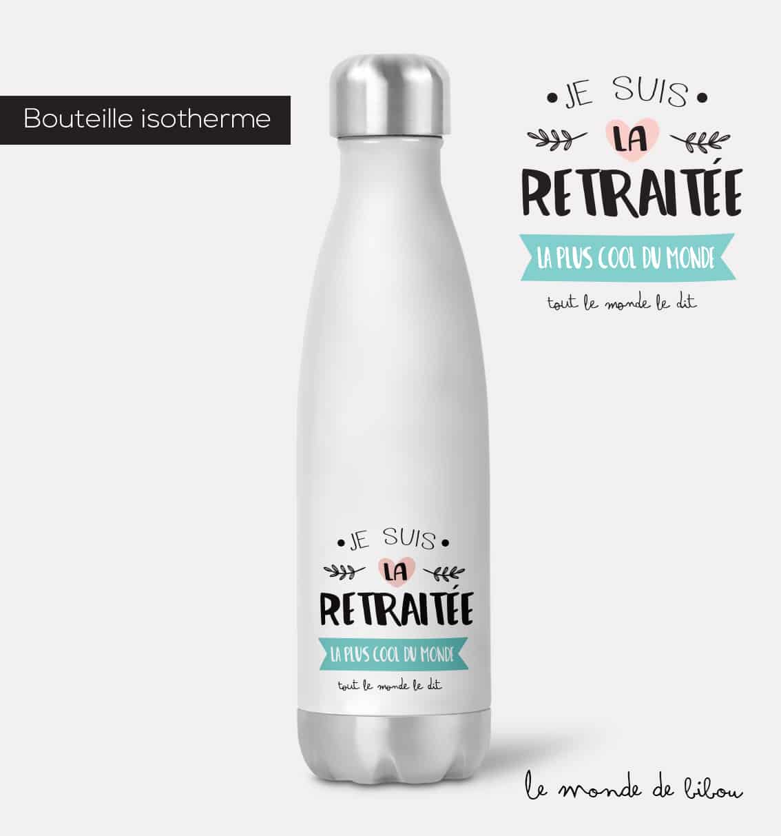 Fini les bouteilles en plastique jetables, vraiment pas écologique, on pense gourde et bouteille isotherme maintenant. Notre Bouteille isotherme Retraitée cool est une chouette idée de cadeau personnalisable aussi joli qu’utile qui fera plaisir à coup sûr à tous les jeunes retraités. Notre thermos accompagnera cette collègue, cette patronne ou cette parente et lui permettra de profiter de son nouvel emploi du temps et de la liberté qui lui est offerte ! Une façon originale de remercier et de féliciter une collègue ou une amie qui part à la retraite. Une petite attention personnalisée pour que le départ à la retraite de la personne de votre entourage soit mémorable!
