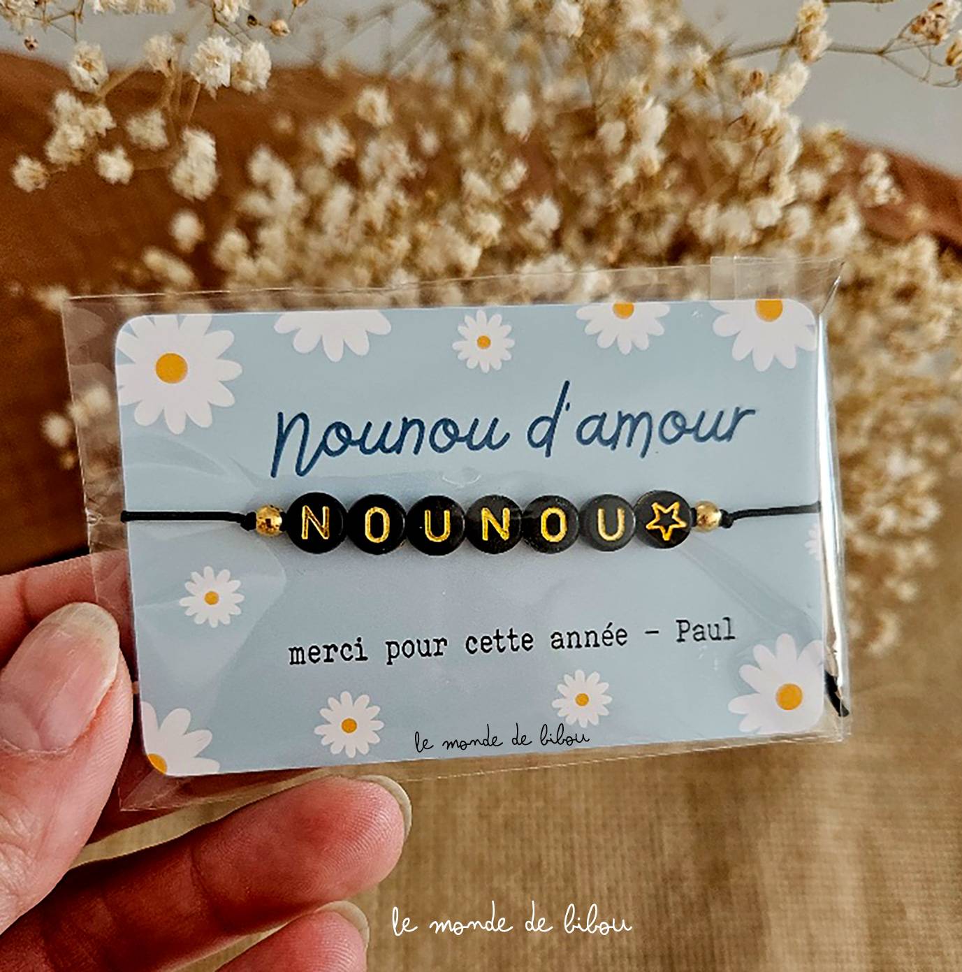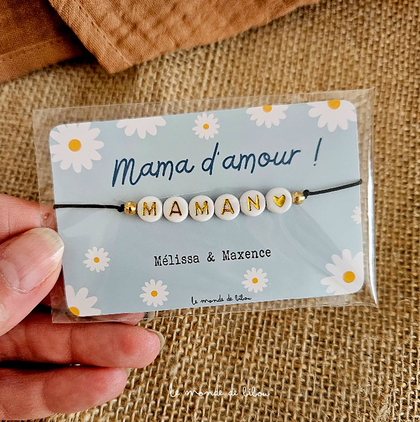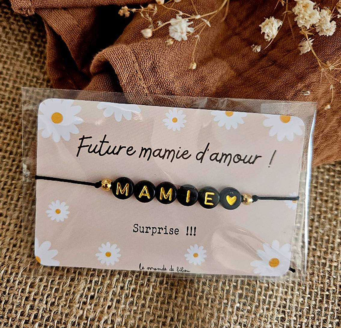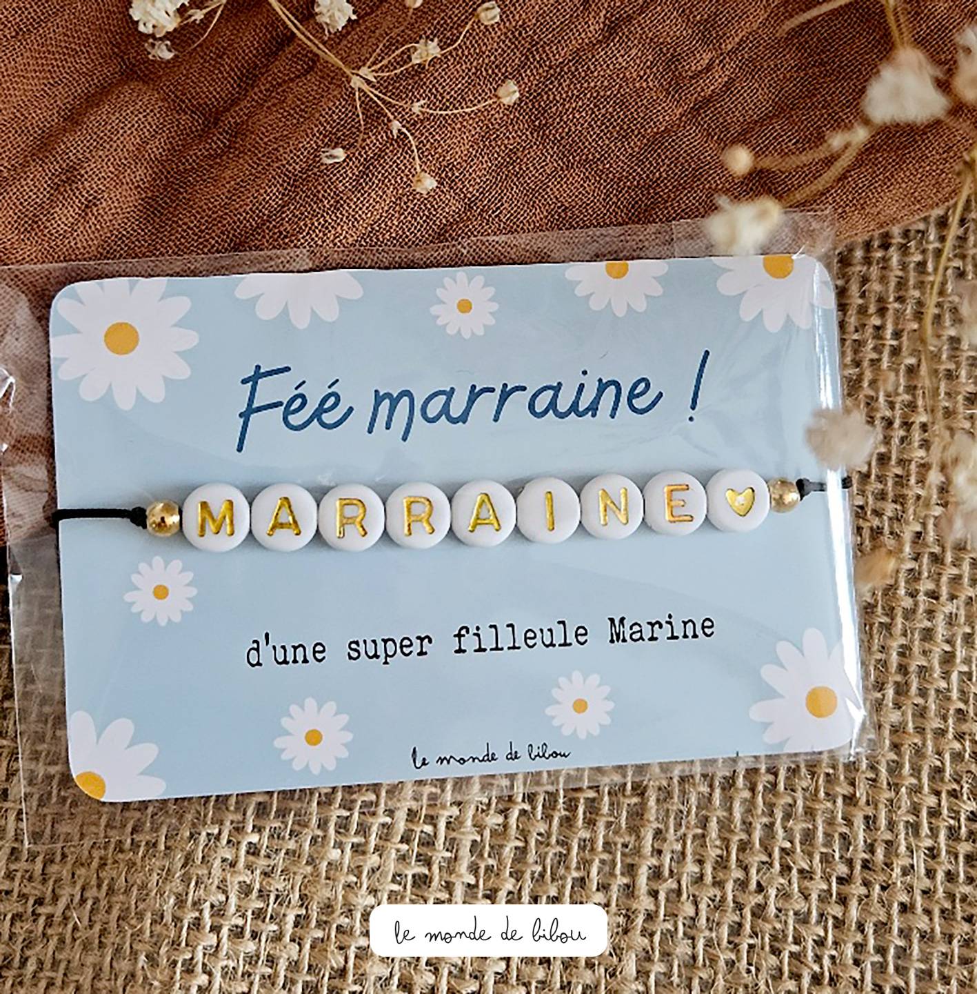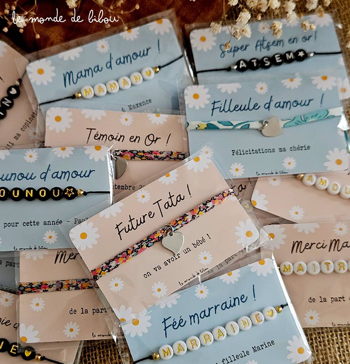 Ce Bracelet perles et sa carte personnalisée  sont un super cadeau à offrir à la personne que vous voulez : une marraine, une nounou, une maitresse ou encore une témoin etc… Idéal pour faire une annonce surprise personnalisée ou une demande originale (comme une demande témoin ou marraine ou une annonce future mamie … Il ne faut pas hésiter, car c’est un cadeau annonce personnalisé pour toutes les occasions : cadeau anniversaire, fête des mères, fête des grand-mères, cadeau de Noël, cadeau de mariage, etc.