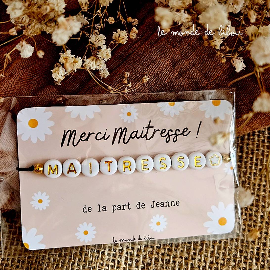 Ce Bracelet perles et sa carte personnalisée  sont un super cadeau à offrir à la personne que vous voulez : une marraine, une nounou, une maitresse ou encore une témoin etc. On adore son thème marguerite très tendance ! Idéal pour remercier la maitresse de votre enfant ou encore pour annoncer une future naissance à une mamie. La carte est 100% personnalisable !