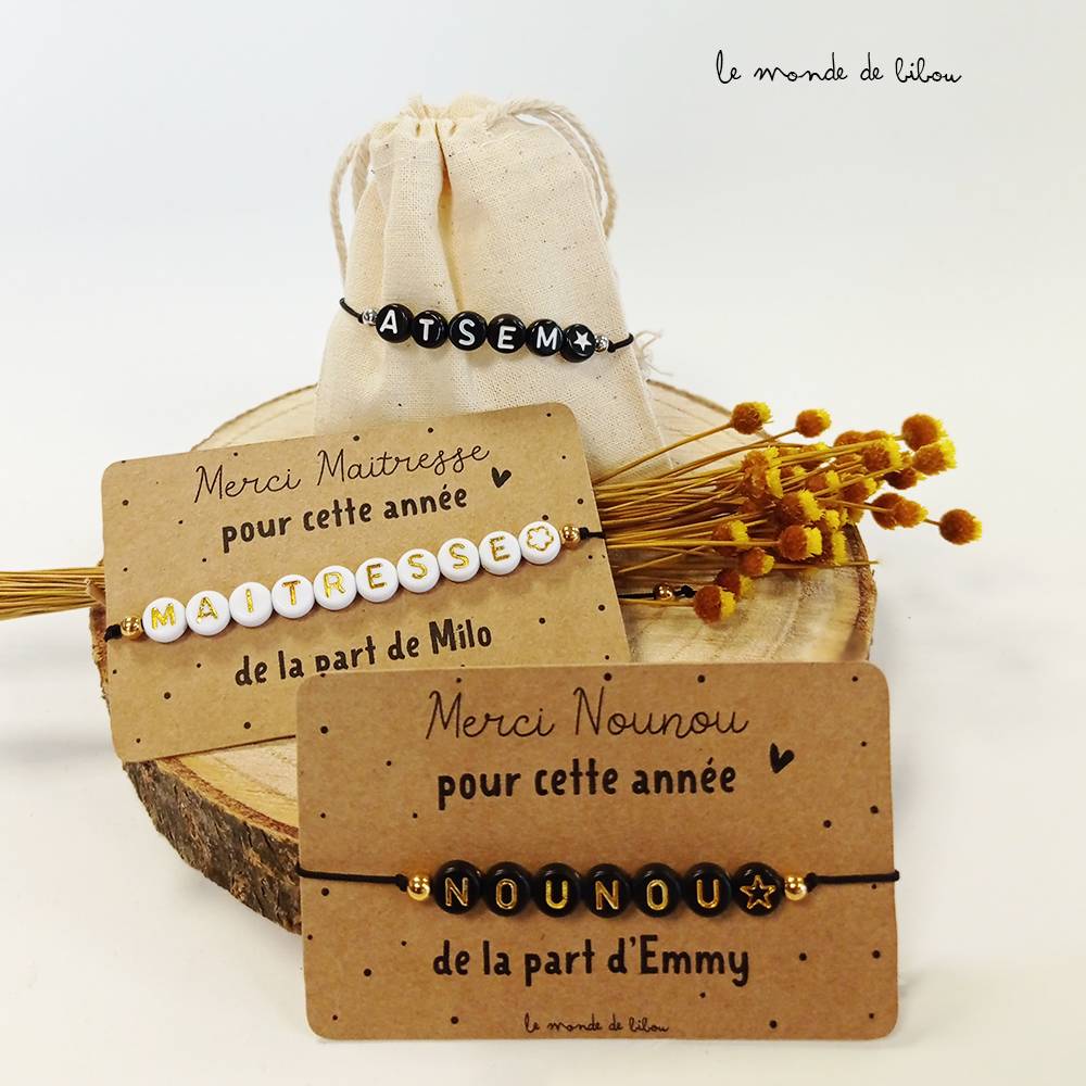 Cette Carte bracelet perles Maîtresse Nounou Atsem personnalisée est un super cadeau à offrir à la personne que vous voulez : une maîtresse, une Atsem ou une nounou, etc… C’est le petit cadeau maitresse idéal à offrir à l’occasion des fêtes de Noël, à la fin de l’année scolaire ou pour un anniversaire. Pour toute l’attention qu’elles ont apporté à votre enfant, elles méritent un petit cadeau, une petite attention qui fera forcément plaisir.