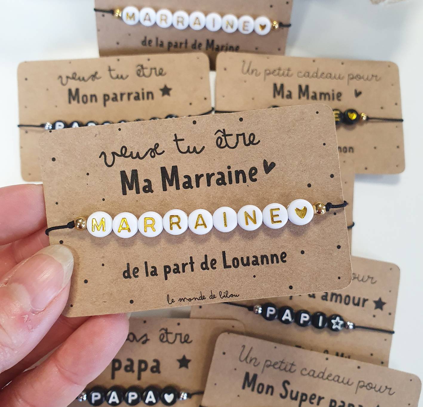 Cette Carte bracelet perles Parrain Marraine personnalisée est un super cadeau à offrir au parrain ou à la marraine de votre enfant. Idéal pour faire une annonce surprise personnalisée ou une demande parrain marraine originale. Il ne faut pas hésiter, car c’est un cadeau annonce personnalisé pour toutes les occasions : cadeau anniversaire, Baptême, Communion, cadeau de Noël, etc…