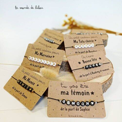 Cette Carte bracelet perles personnalisée est un super cadeau à offrir à la personne que vous voulez : un papi, une marraine, une nounou, etc… Idéal pour faire une annonce surprise personnalisée ou une demande originale (comme une demande témoin ou parrain marraine ou une annonce future mamie ou futur papa… Il ne faut pas hésiter, car c’est un cadeau annonce personnalisé pour toutes les occasions : cadeau anniversaire, fête des mères, fête des grand-mères, cadeau de Noël, cadeau de Saint-Valentin, cadeau de mariage, etc.