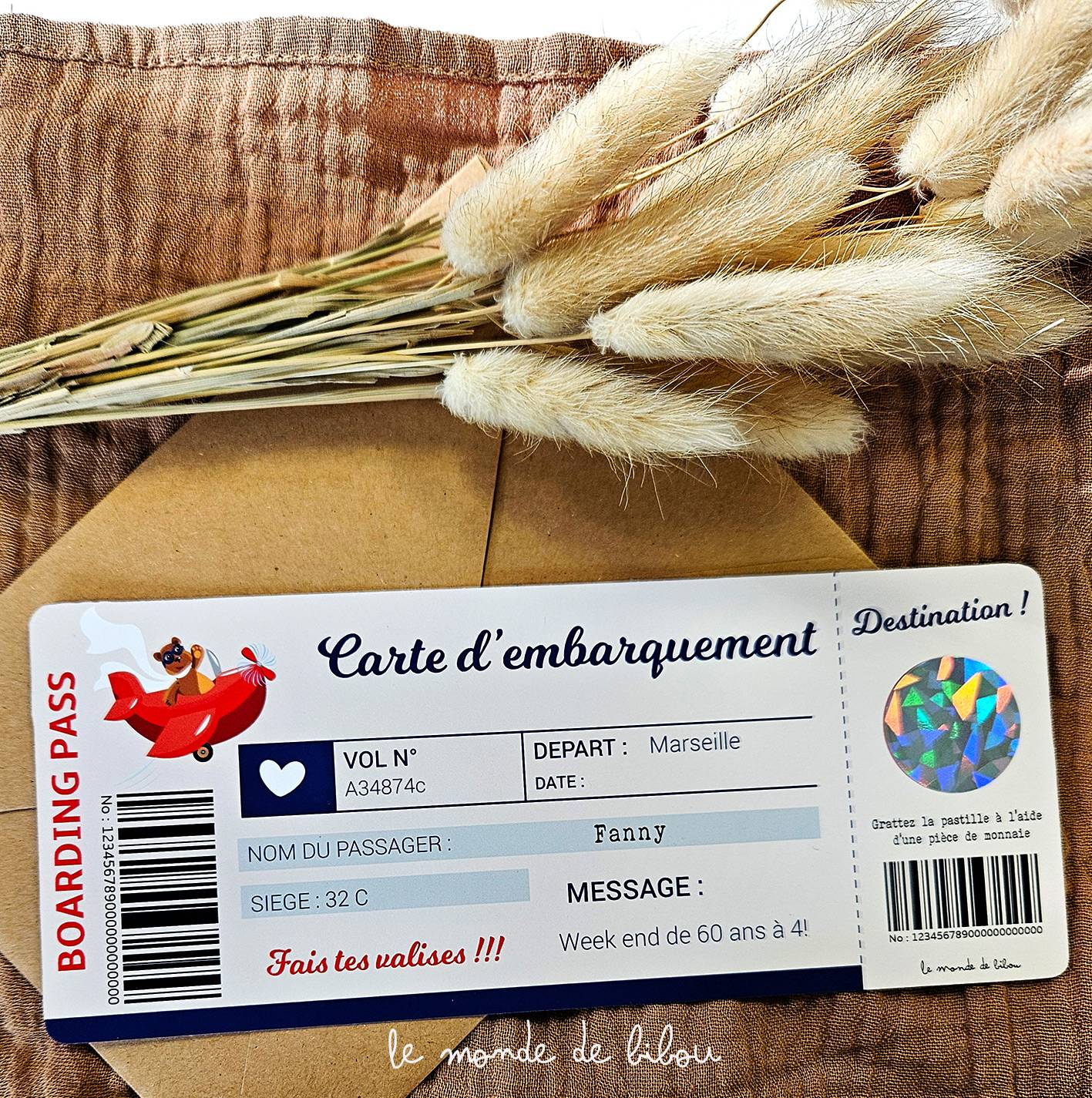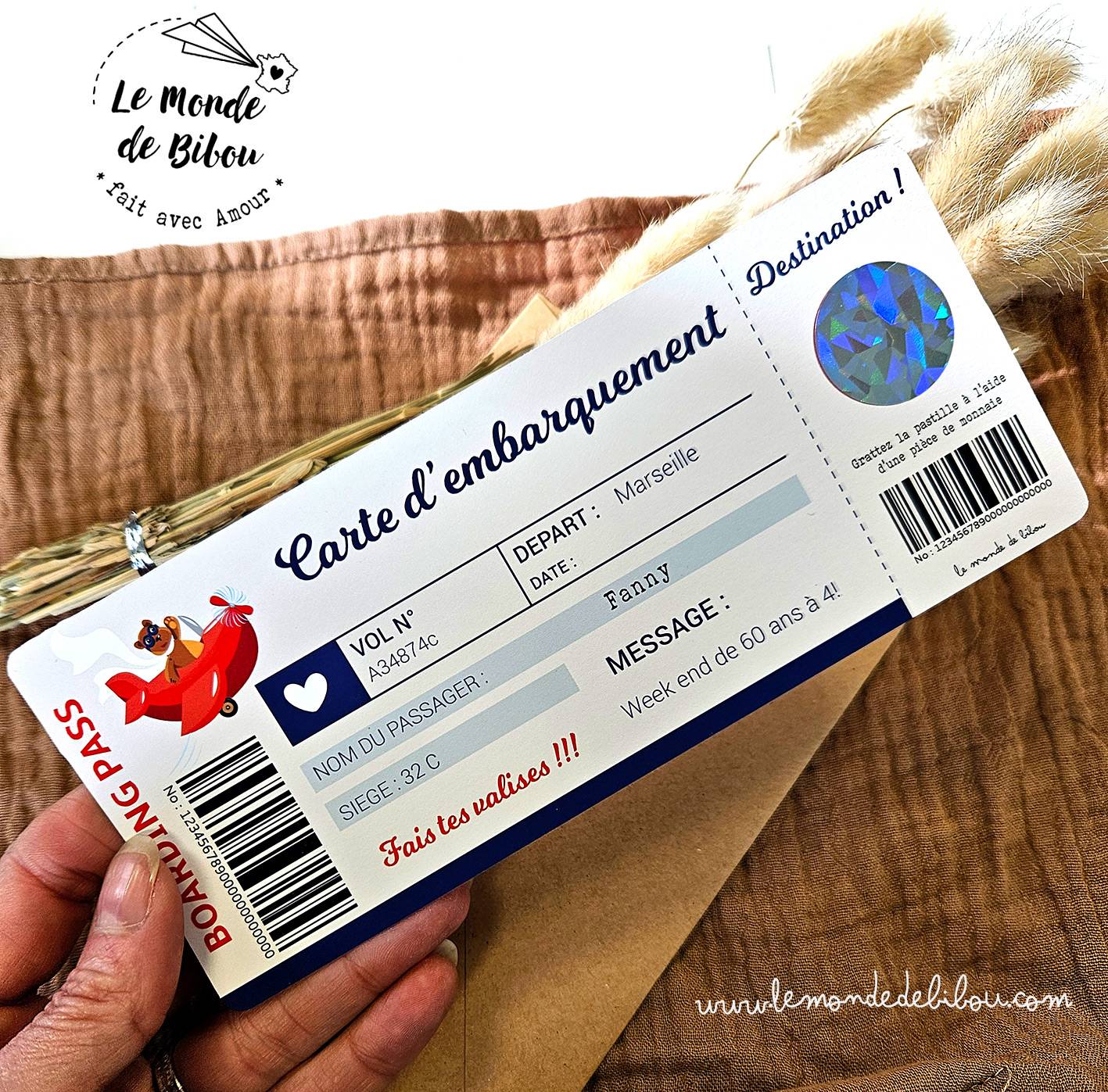Une jolie Carte à gratter pour une surprise originale, il faudra gratter la pastille pour découvrir la destination surprise. Vous indiquez votre date, le passager, la date et le lieu du départ, ainsi que votre petit message personnel (Votre texte doit être une phrase courte !). Faites vos plus belles annonces avec nos tickets jeu à gratter.