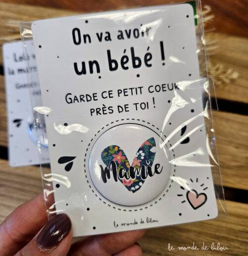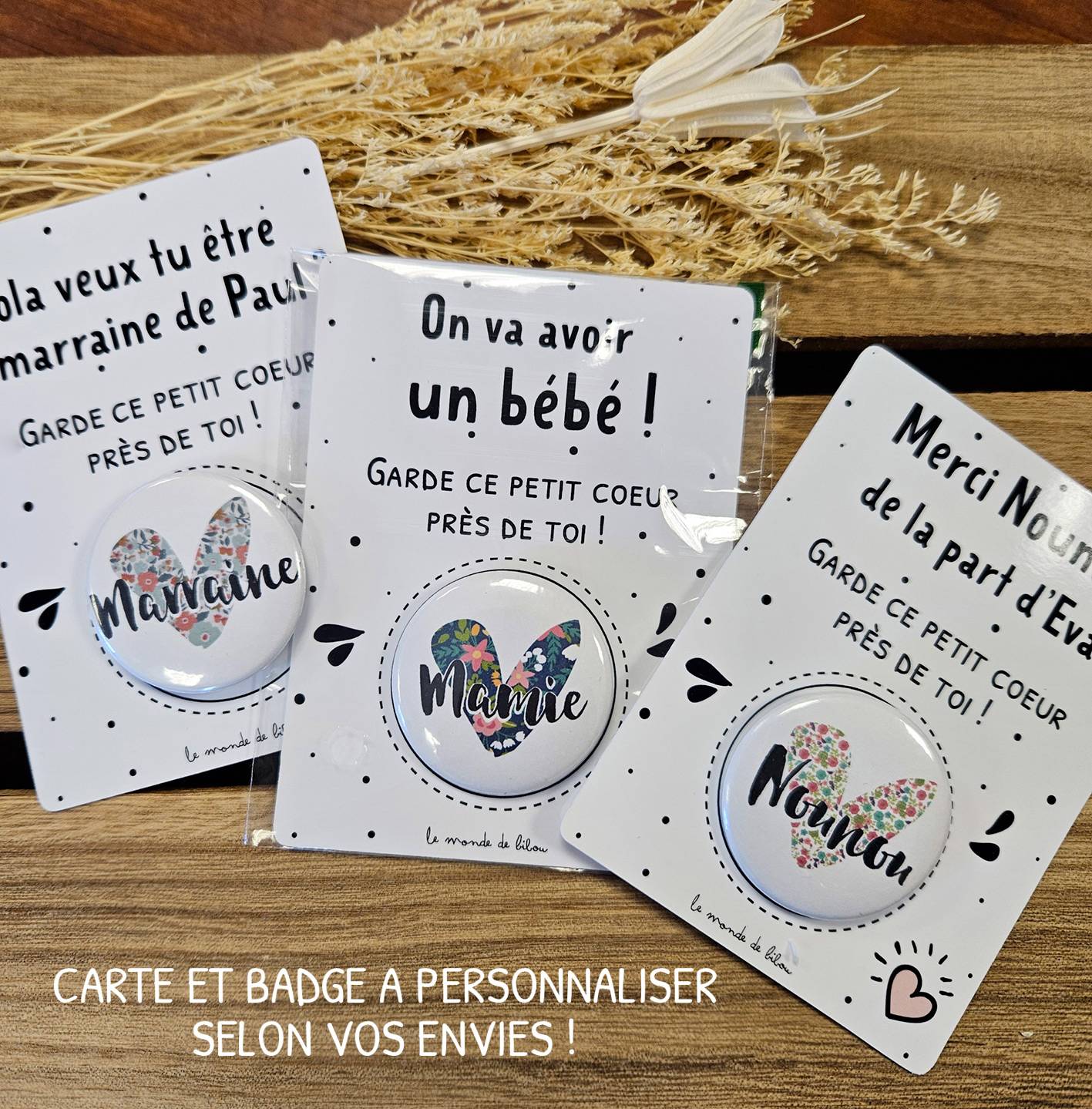 Voici un adorable cadeau complétement personnalisable selon vos envies. Annoncez votre grossesse à votre maman, ou à la future marraine ! Déclarez votre flamme ou remercier la nounou de votre enfant avec notre carte badge annonce … Tout est réalisable ! Choisissiez un motif parmi nos 8 motifs et couleurs.