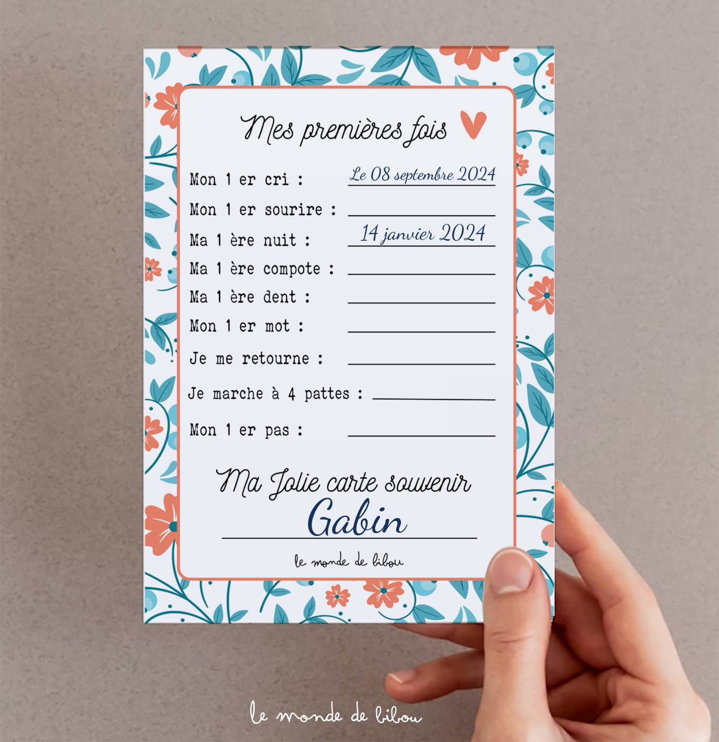 A chaque étape de bébé comme son premier sourire ou sa première compote, indiquez la date de ce merveilleux jour sur la carte souvenir de mes premières fois pour qu’il reste gravé dans votre mémoire.