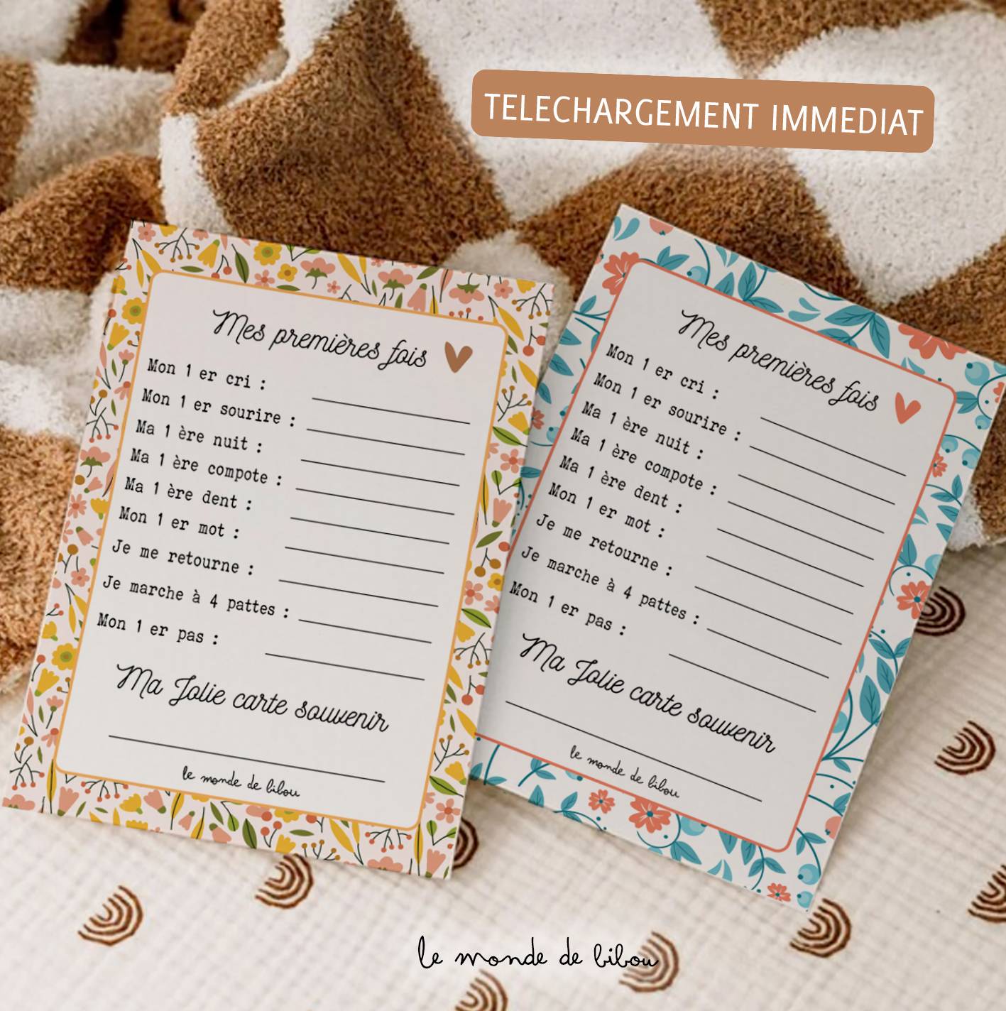Votre petit Bibou vient de pointer le bout de son nez. C’est le début de toutes ses premières fois. Nous avons imaginer cette jolie carte souvenir Mes premières fois. Cette carte est téléchargeable immédiatement après la validation de votre commande. La carte souvenir pour bébé existe en deux versions liberty.