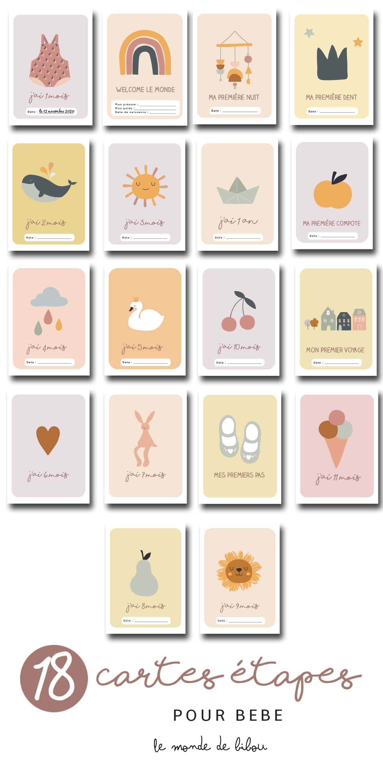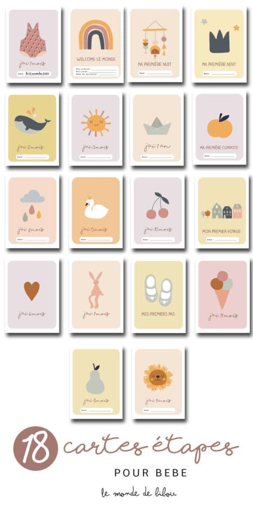 Grâce aux 18 cartes téléchargeables et à imprimer par vos soins vous annoncerez les étapes importantes de votre bébé à votre famille et à vos amis de façon ludique. De magnifiques souvenirs de votre enfant puisque nos cartes étapes peuvent être rangées précieusement dans l’album photo de bébé !