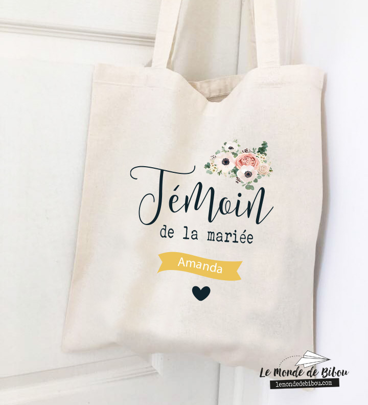 - Un sac tote bag personnalisé au prénom de la future témoin en coton naturel, « Témoin de la mariée » – dim : 38 x 42 cm
