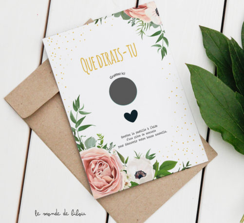- Une carte à gratter « Que dirais-tu d’être ma super témoin ? » – dim : 10 x 15 cm