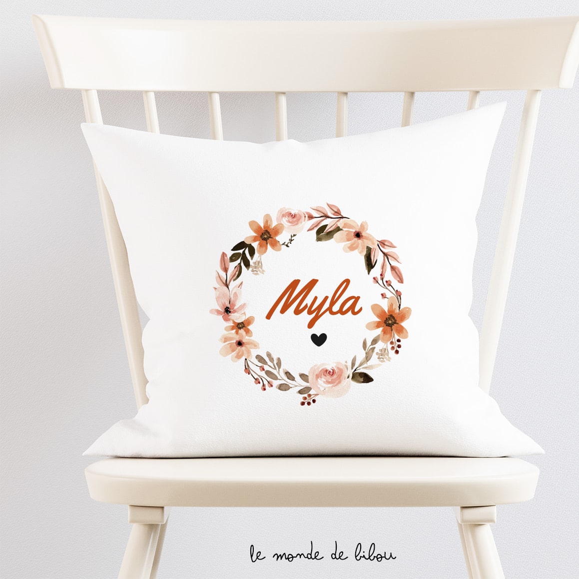 Notre joli Coussin Couronne de fleurs terracotta accompagnera votre enfant pour la maternelle ou pour la crèche. Il sera aussi un objet décoratif pour la chambre de votre petit. Le coussin est personnalisé à son prénom.