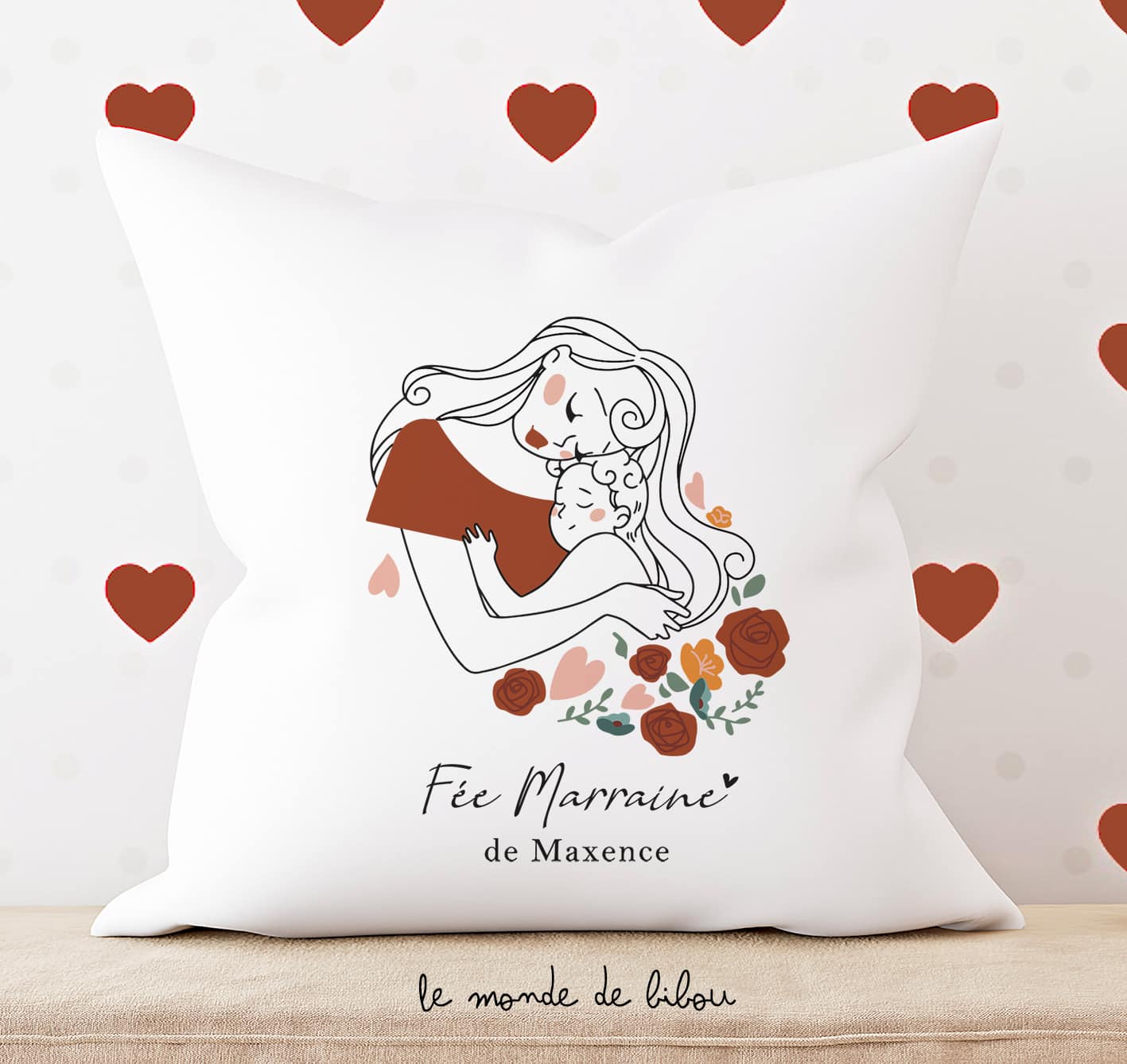 Offrez un cadeau unique avec ce Coussin personnalisé Fée marraine. Ce coussin décoratif est personnalisée au prénom du filleul ou de la filleule. C’est une belle attention pour remercier la marraine de votre enfant. La pochette pour Marraine est aussi un chouette cadeau à offrir lors d’un Baptême, d’une Communion, d’un anniversaire ou encore pour les fêtes de Noël.