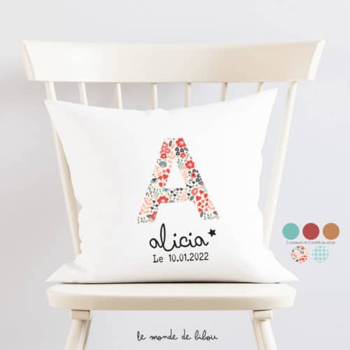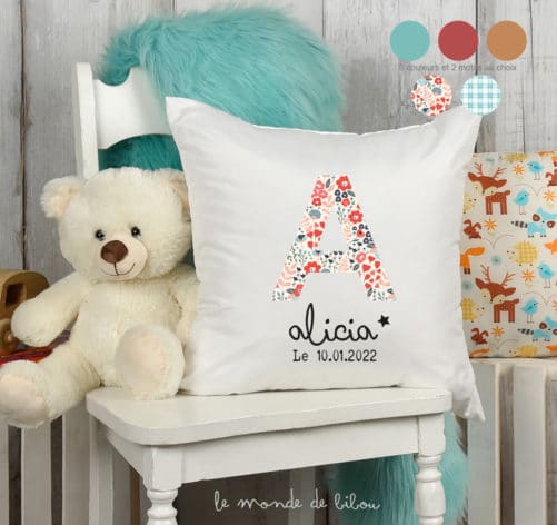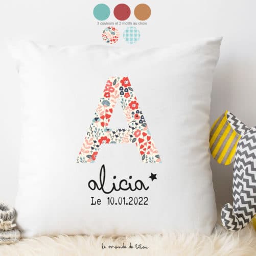 Ce coussin pour se souvenir de la naissance de bébé est une jolie idée de cadeau à offrir à l’occasion d’une naissance ou tout autre évènement heureux. Indiquez le coloris choisi parmi les 3 couleurs unies et les 2 motifs (Vichy bleu et Liberty), puis indiquez nous le prénom de l’enfant ainsi que sa date de naissance.