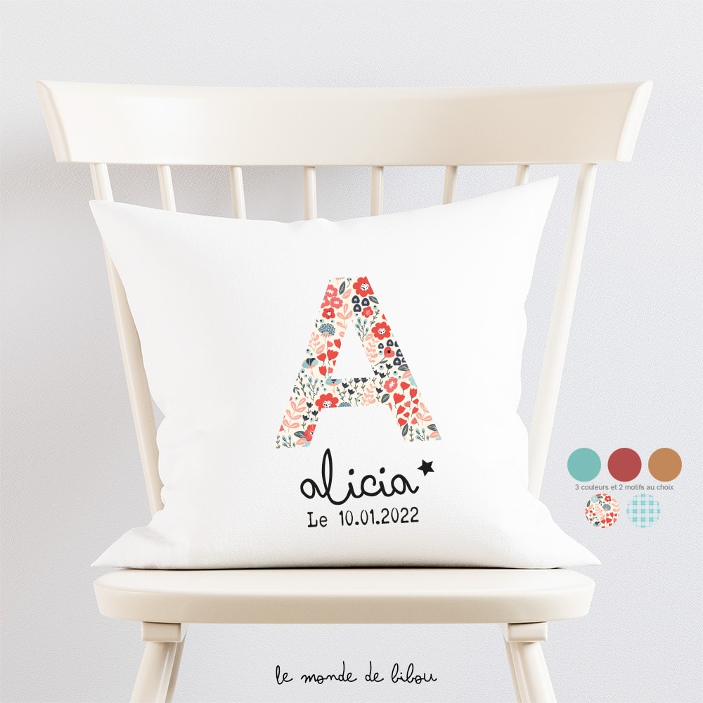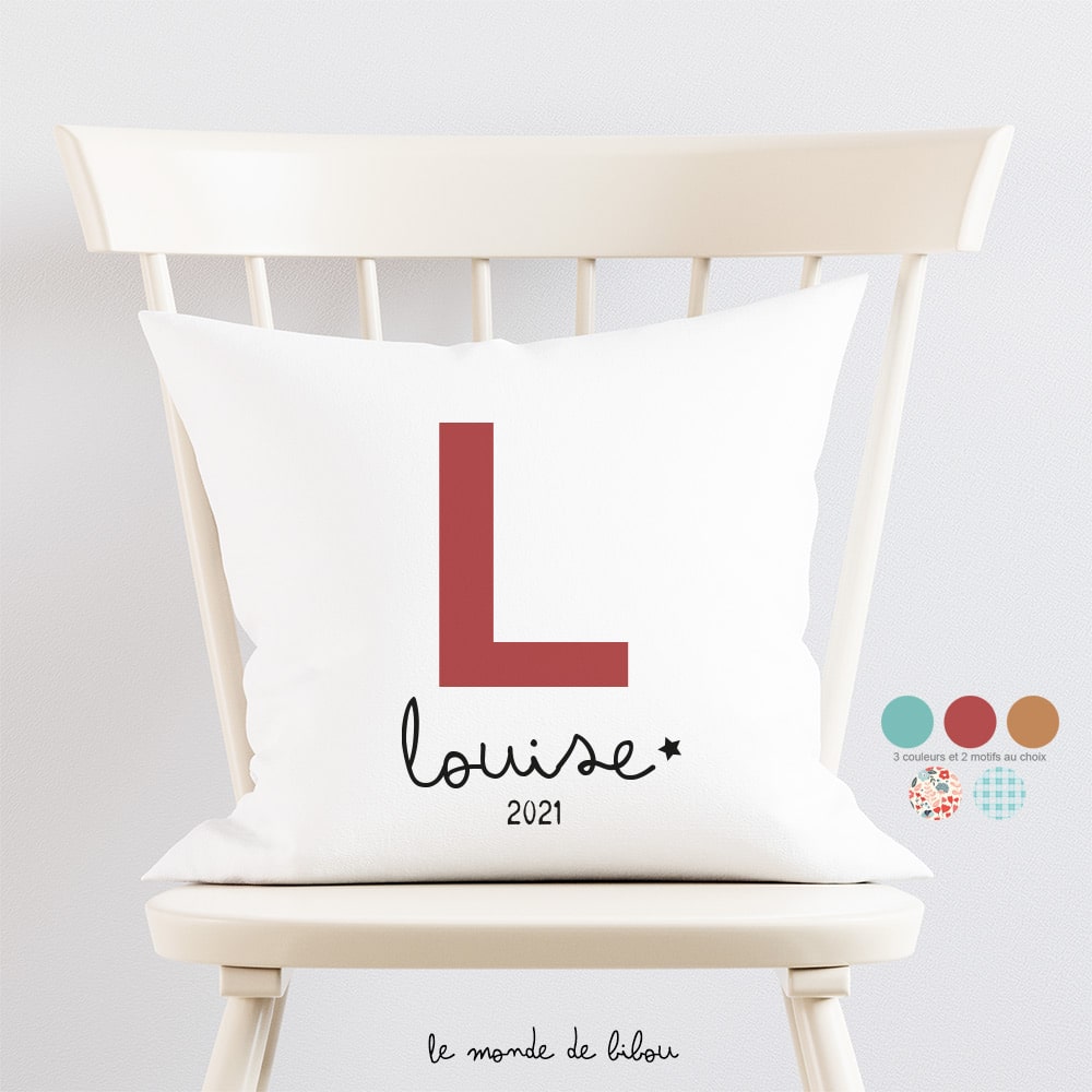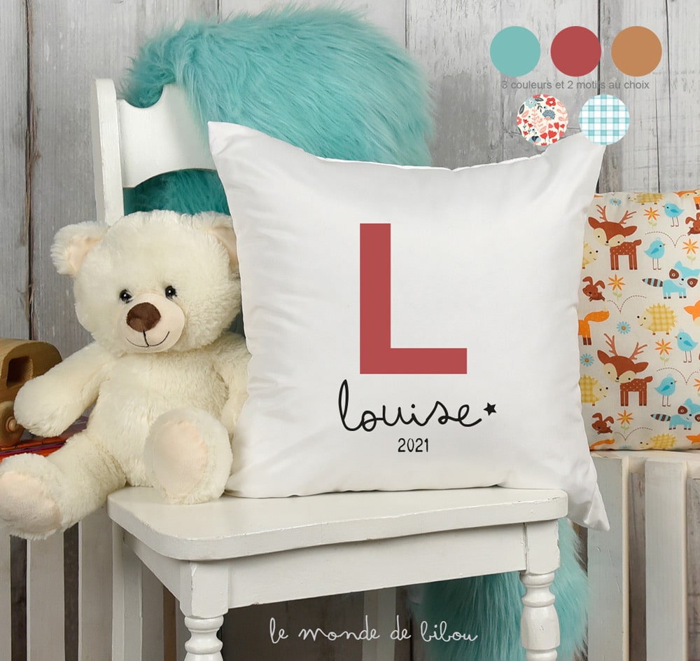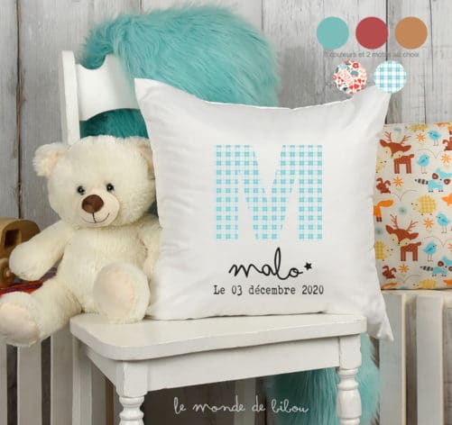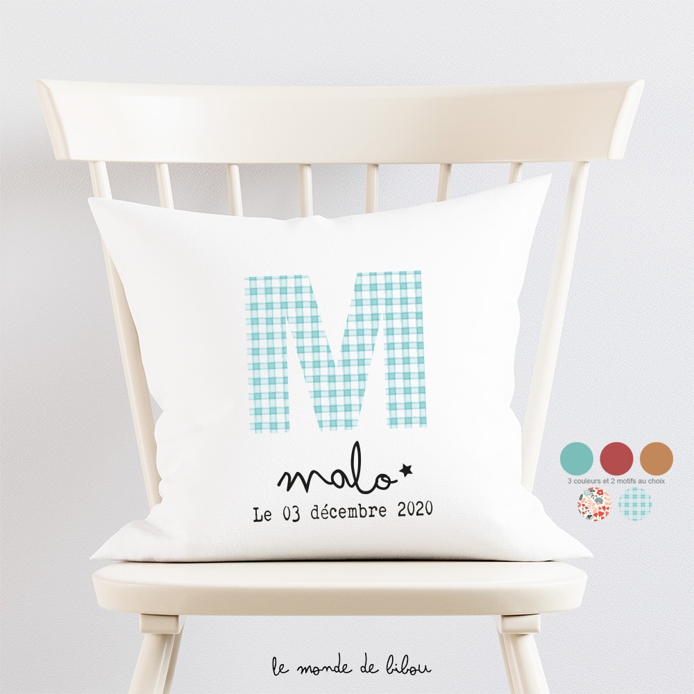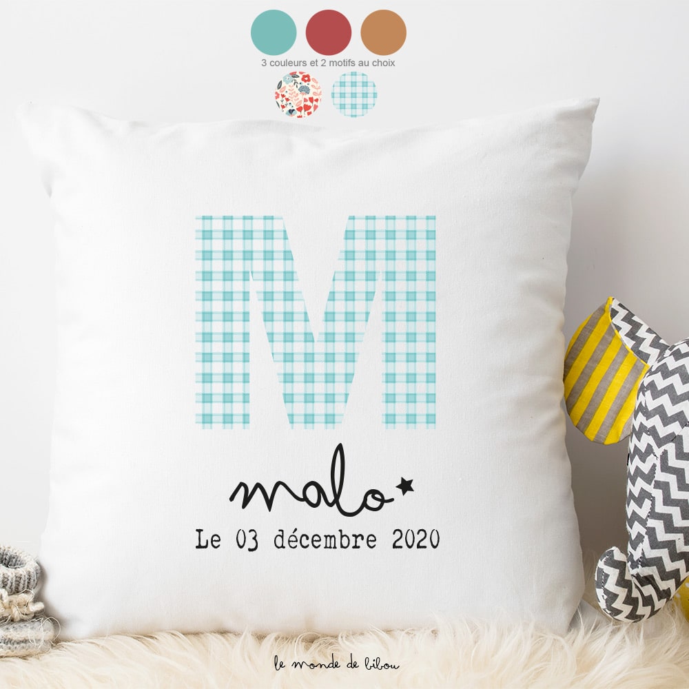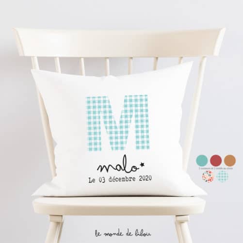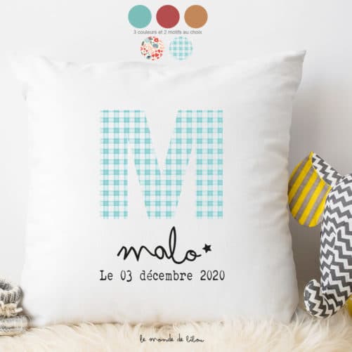 Vous recherchez un cadeau naissance original et personnalisé ? Ce mignon Coussin personnalisé Initiale disponible en 3 couleurs unies et 2 motifs (Vichy bleu et Liberty), une idée de cadeau de naissance original. Ce joli coussin personnalisé trouvera sa place dans une chambre d’enfant. Il peut également très facilement convenir comme cadeau pour un baptême, d’une communion ou d’un anniversaire… puisque c’est vous qui personnalisez avec l’évènement que vous souhaitez…