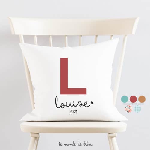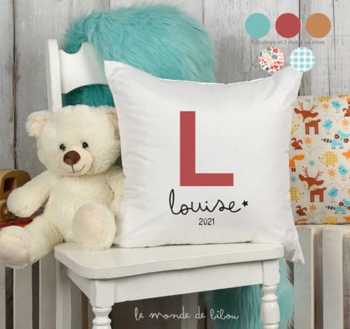 Notre Coussin personnalisé Initiale vous plaît ? Retrouvez tous nos cadeaux naissance et nos présents pour les futurs parents dans la boutique avec des jolis produits tels que pochettes de rangement, trousses de toilettes, affiches, tote bags, sacs de rangement…