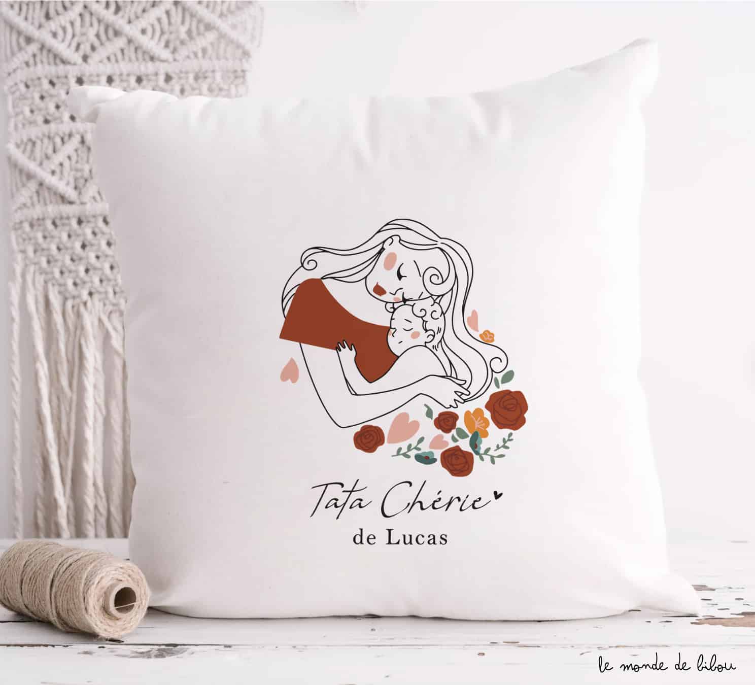 Offrez un cadeau unique avec ce Coussin personnalisé Tata chérie. Ce coussin décoratif est une chouette idée de cadeau personnalisé à offrir à celle que vous souhaitez : à votre sœur, votre belle-sœur ou votre propre tante… On adore ce cadeau personnalisé pour Tatie ! C’est le cadeau idéal à offrir à l’occasion d’un anniversaire, comme cadeau de Noël ou juste comme ça pour faire plaisir à cette tatie qui compte pour vous…